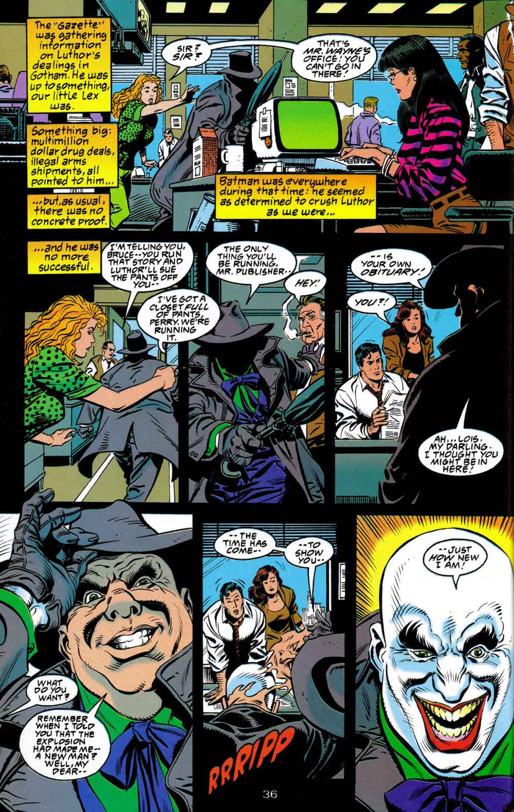 اوضاع زمانی به نقطه اوج خود میرسد که لوتر به دفتر گاتهام گزت برای انتقام گرفتن از بروس به خاطر بیرون انداختنش بازمیگردد. آشکار میشود که لکس دچار یک حادثه در کارخانه مواد شیمایی شده است که پیامدش تبدیل ظاهر او به چیزی شبیه به جوکر بود. او همچنین یک چتر در دست دارد که مثل چتر پنگوئن از قابلیتهای دفاعی و تهاجمی بهره میبرد. لوتر با این یورش لوئیس را میدزدد و با بالگرد کوچک متصل به پشتش میگریزد.