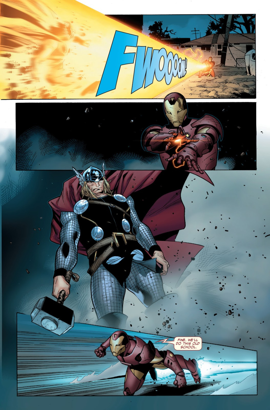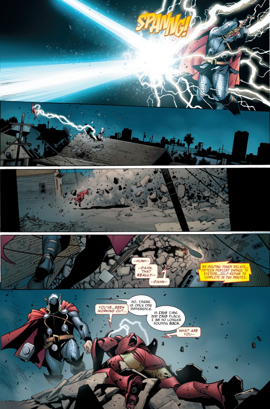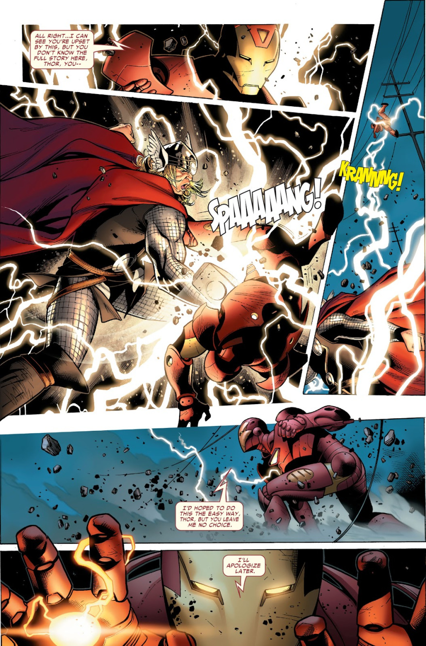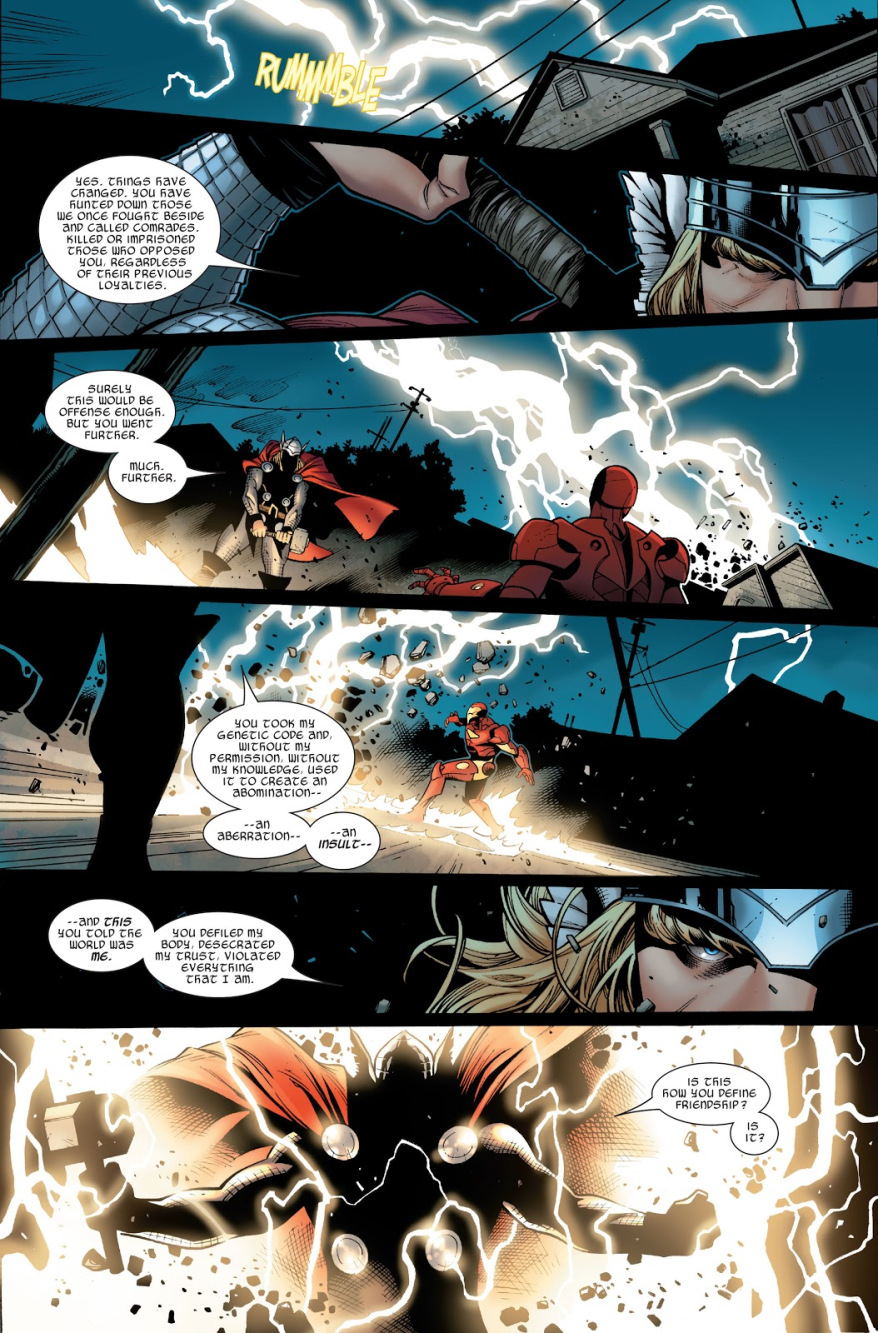 جواب خدای رعد چیزی است که از یک جنگجوی نوردیک انتظارش را میکشید. یک نبرد بین آیرون من و ثور آغاز شد که نتیجه آن شکست مرد فلزی پرنده بود. ثور به آیرون من گفت که این بار دیگر جلوی خودش را نمیگیرد و بهتر است تهدیدهایش را پیش کسانی ببرند که از جنگیدن با او میترسند. با این که ثور در جنگ داخلی شرکت نکرد اما مطمئن شد آیرون من فهمیده که او خدای رعد است، نه یک موجود فانی.