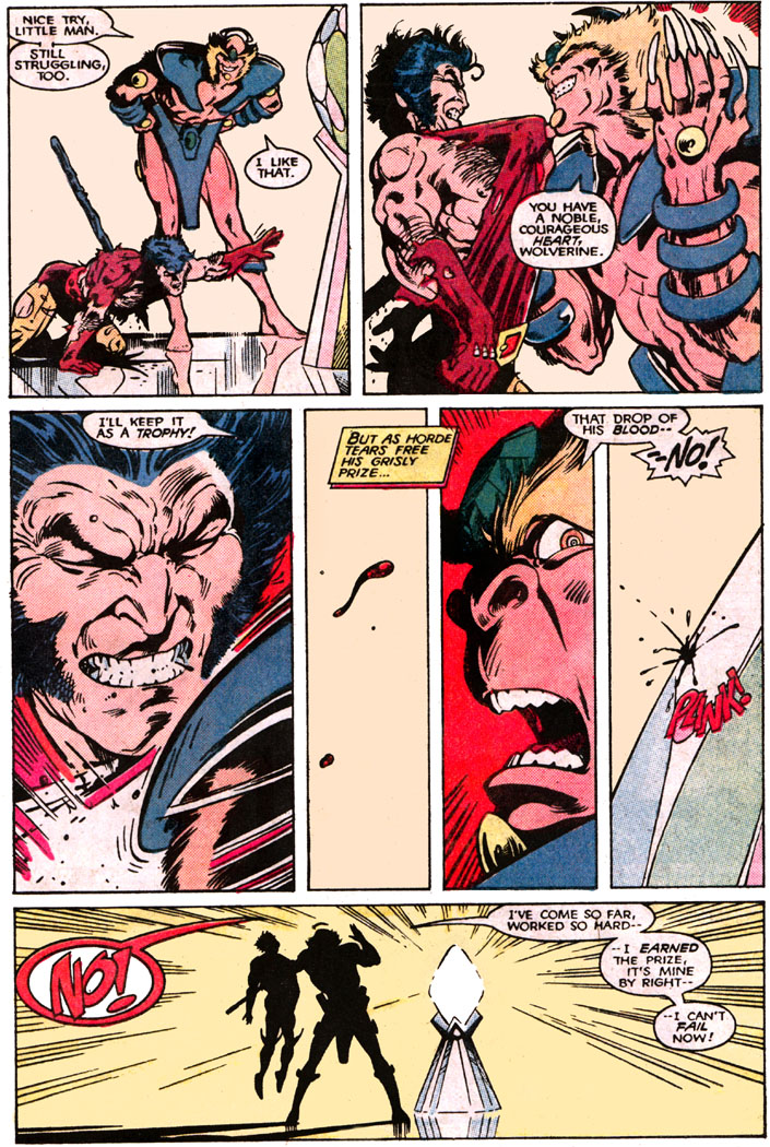در تلاشی برای به قتل رساندن ولورین، یکی از اعضای بینام نژاد هورد (Horde) قلب او را از بدنش بیرون میکشد. با وجود عامل التیام اما از بین رفتن یکی از اعضای حیاتی بدن ولورین میتواند باعث مرگ او شود (حداقل در این خط داستانی). این ویلن نیز خیلی به قتل ولورین نزدیک شد اما بدن دیگری برای لوگان با قطره خونی که روی یک شی فضایی جادویی میافتد، تشکیل میشود.