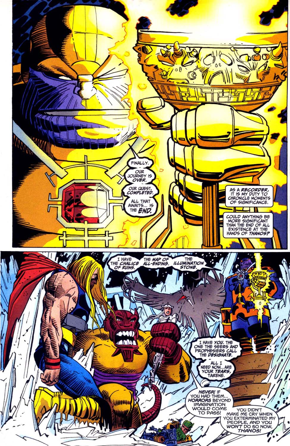وضعیت ثور در برابر تانوس در شماره ۲۵ کمیک Thor پیش از کمک اودین (برای دیدن سایز کامل روی تصویر کلیک کنید)