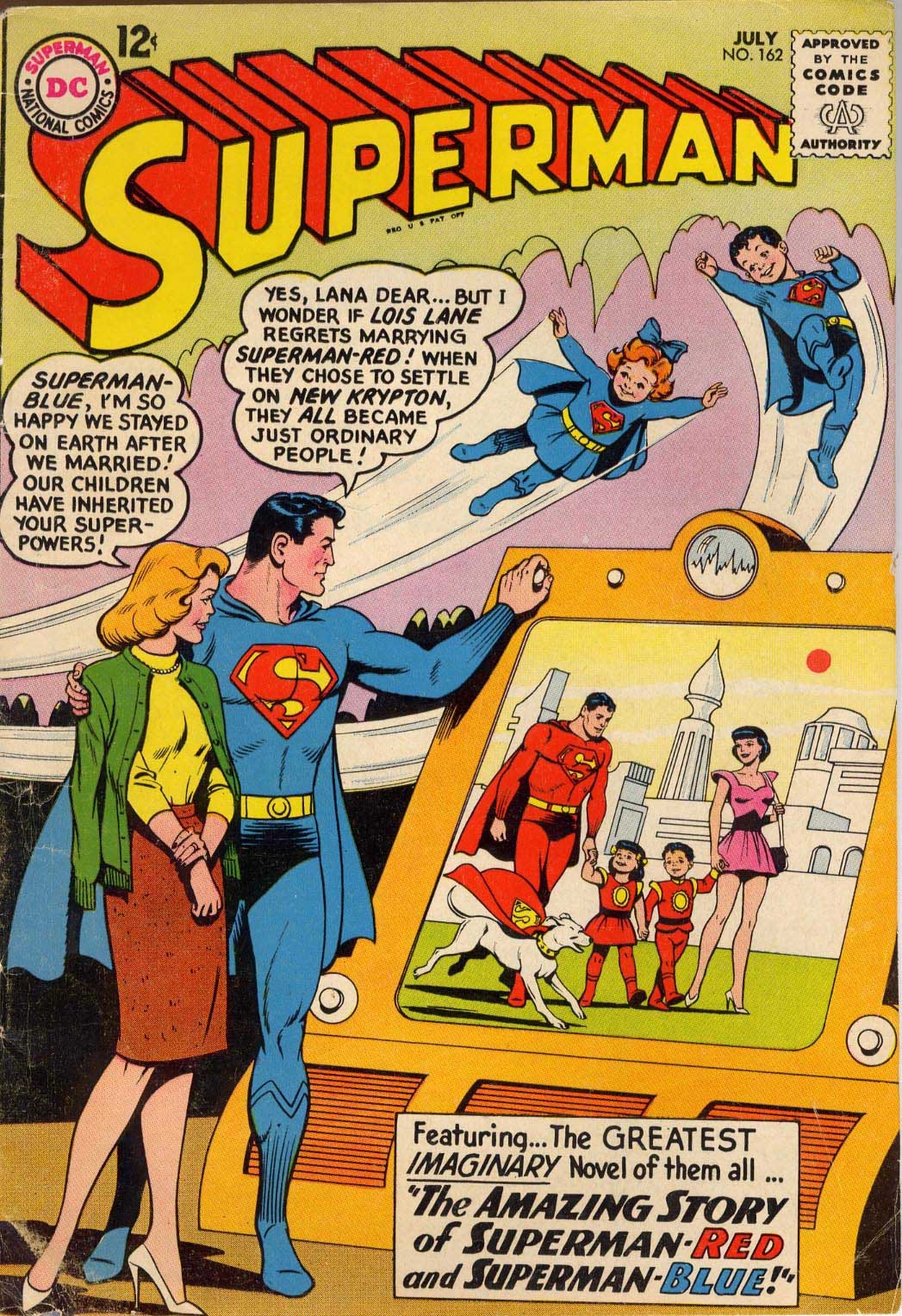 در همین حال، او یک نسخه متفاوت از خودش به وجود میآورد که لباسهای کاملا قرمز به تن دارد. این دو سوپرمن با همکاری هم سیاره کریپتون را دوباره به وجود میآورند، به کاندوریها کمک میکنند تا شهرشان را به اندازه اصلیاش درآورند و یک تفنگ لیزری میسازند که همه شرارت را از زمین بیرون میکند. سپس، این دو مرد پولادین بازنشسته میشوند. سوپرمن قرمز نیز با لوئیس لین و سوپرمن آبی نیز با لانا لنگ ازدواج میکند.