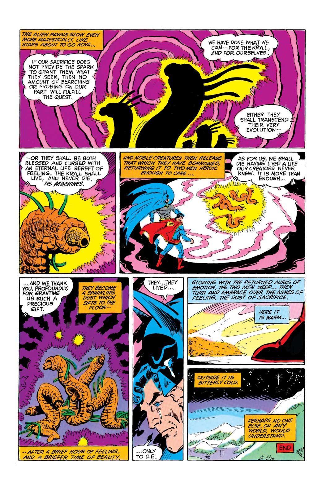 شماره ۲۸۹ کمیک World's Finest Comics یکی از عجیبترین رفاقتها را به تصویر میکشد. همه چیز با اقامت بتمن در دژ تنهایی سوپرمن آغاز میشود و به ناراحتی این دو به خاطر مرگ کرمهای فضایی میرسد. مرد پولادین و شوالیه تاریکی تصمیم میگیرند که نظراتشان درباره همدیگر را به اشتراک بگذارند که باعث جلب توجه کرمهای فضایی میشود.
