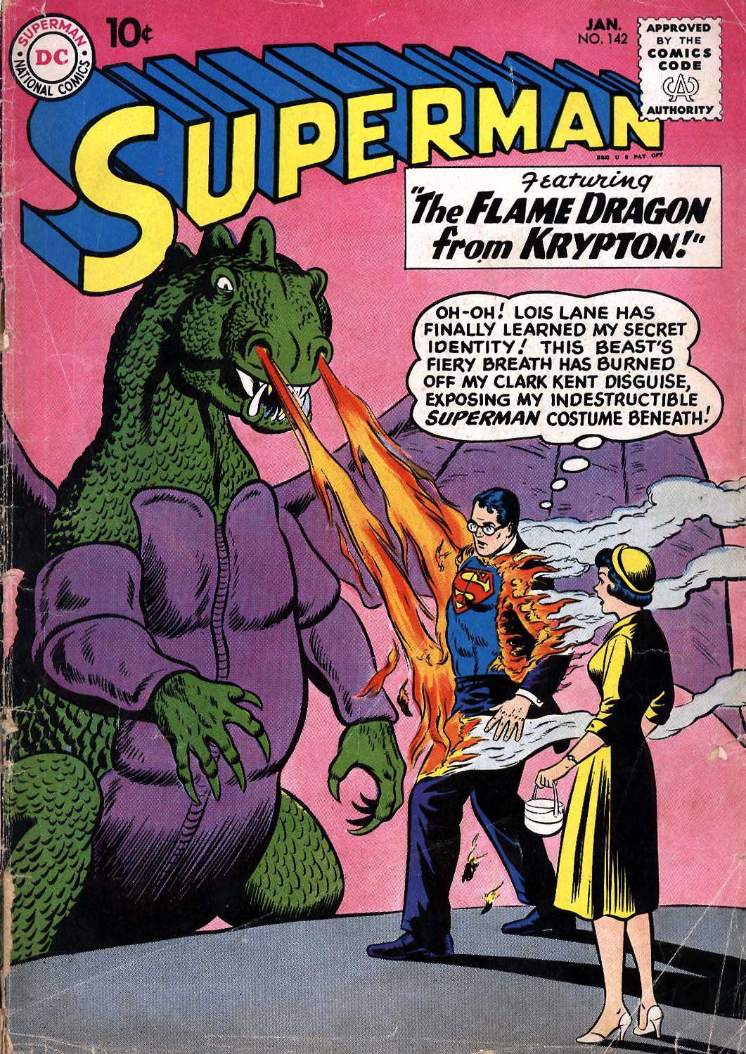 در شماره ۱۴۲ کمیک Superman شاهد یک داستان هستیم که در آن کریپتوی ابر-سگ سعی دارد تا کاری کند که مرد پولادین از لوئیس لین درخواست ازدواج کند. اما یک ماجرای دیگر در همین شماره وجود دارد که روی دست داستان قبلی زده است. در داستان The Flame-Dragon from Krypton، همان جور که از نامش آشکار است، یک اژدهای آتشزا سر میرسد تا نویسندگان به کمکش کاری کنند هویت راستین سوپرمن برای لوئیس مشخص شود.