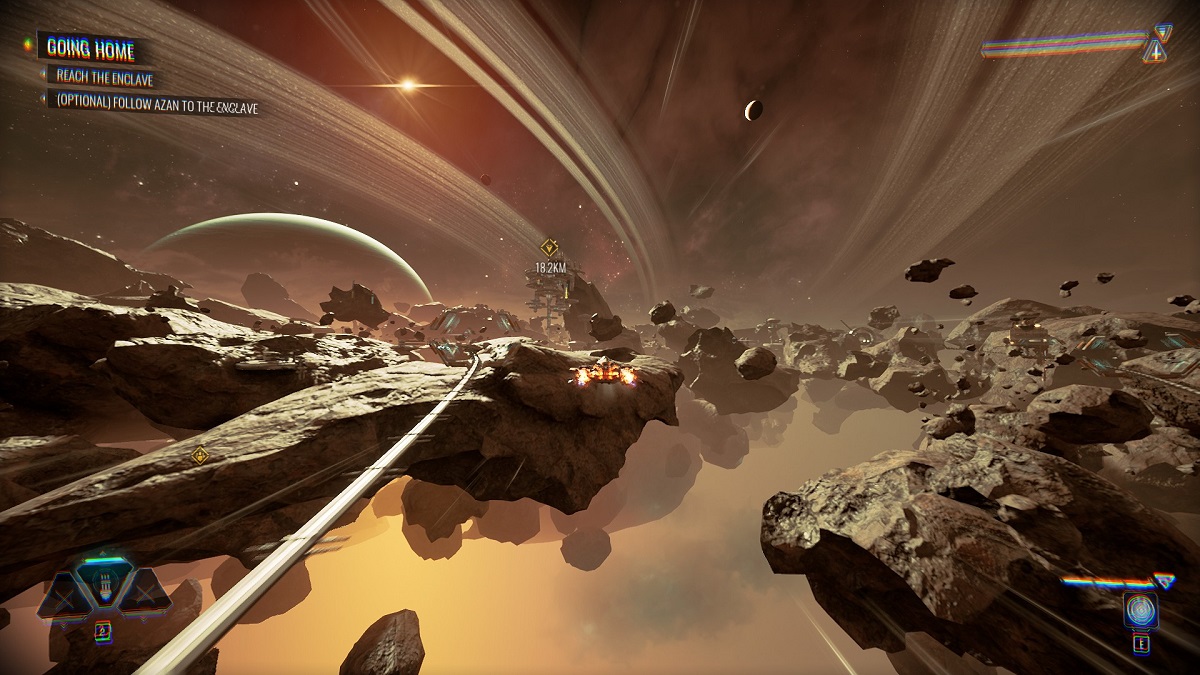 اما بخش اصلی بازی مکاشفات و مبارزات بازی است. قبل از هر چیزی بگذارید به جهان باز Chorus بپردازیم. بازی یک خط داستانی اصلی دارد اما در کنار آن، گشت و گذار در محیط و روبرو شدن با شخصیتهای فرعی، با مراحل فرعی همراه است که جایزه و پاداش خاص خودشان را دارند. شخصیتهای فرعی چیز زیادی به قصه اضافه نمیکنند، اما خط اصلی داستانی هم به تنهایی این پتانسیل را دارد که بخش مهمی از جذابیت و محتوای بازی را ارائه دهد.