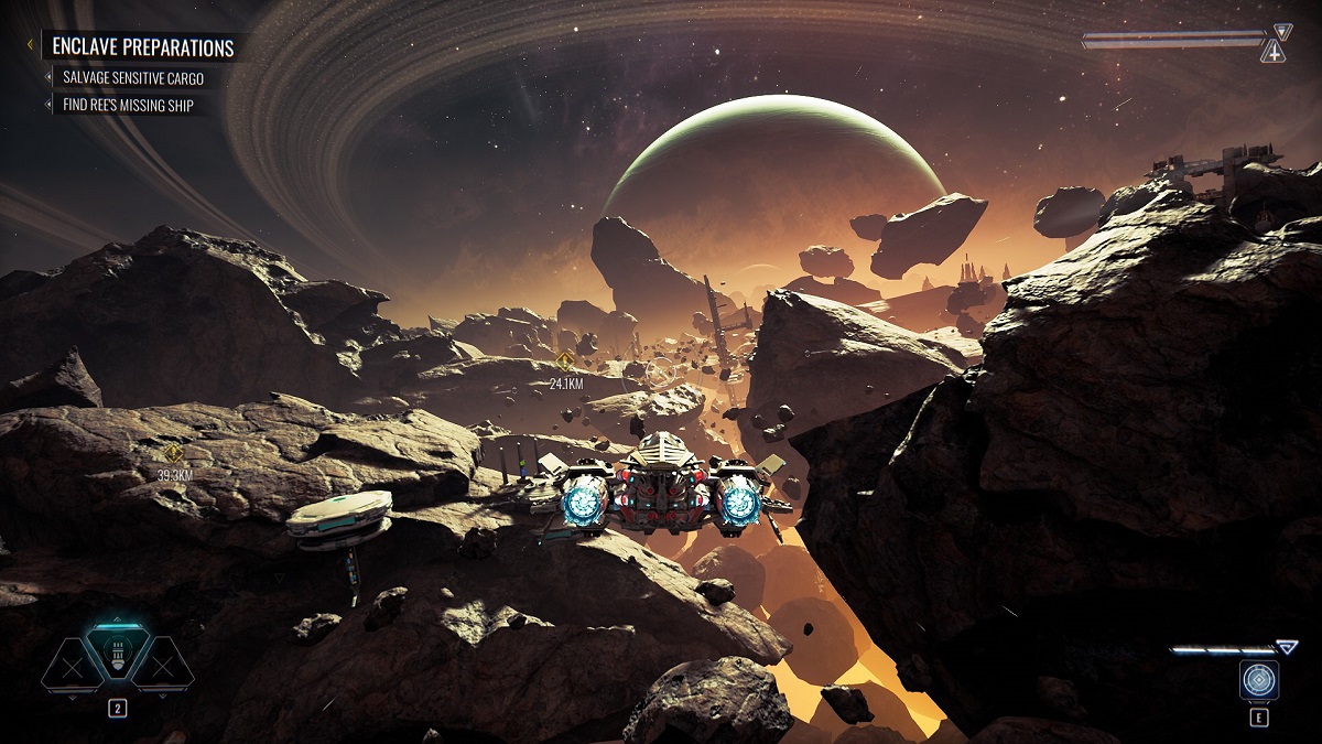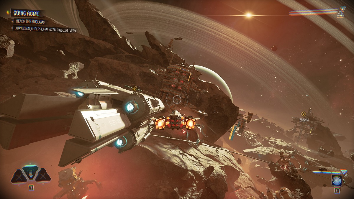 گشت و گذار در بازی همراه با پاداشهایی مثل متریال و آیتمهایی است که میتوانند به ارتقای تواناییهای سفینه فضایی نارا کمک کند. این سفینه در بخشهای مختفی قابلیت شخصیسازی دارد و بازیکنها میتوانند قسمتهای مختلف آن مثل سلاح اصلی، سپر و قابلیتهای فرعی دیگری که به گشت و گذار مربوط هستند را با استفاده از متریال مناسب ارتقا دهند. جایی که بازی کمی لنگ میزند، کنترل کردن سفینه و حس خستهکننده آن بعد از چند ساعت بازی کردن است. قبل از هر چیزی، باید گفت که بازی روی پیسی و با ماوس کیبورد، بهترین تجربه ممکن از یک اسپیس کامبت نیست و حتما استفاده از کنترلر پیشنهاد میشود. مبارزات بازی هم خیلی پیچیده نیستند و در یکی دو کلید محدود خلاصه میشوند. بازی سعی نمیکند خیلی این بخش را جدی بگیرد و در عوض، سعی کرده تا یک بازی سرگرمکننده با قصهای خوب باقی بماند.