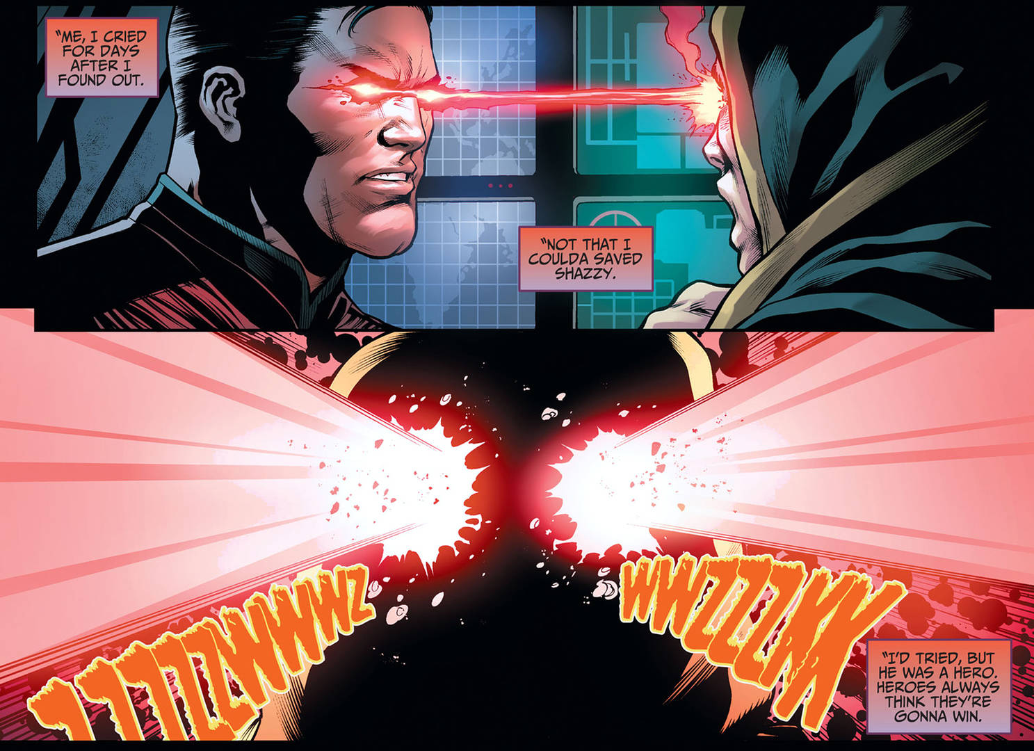 برای هر قهرمان دیگر شاید بتوان این بهانه را استفاده کرد که آنها افراد بالغی هستند که میدانند در حین انجام فعالیتهای خود ممکن است جانشان را از دست بدهند. اما در مورد شزم چنین چیزی صدق نمیکند. سوپرمن نیز تصمیم گرفت در پاسخ حرفهای بیلی، با لیزر منتشر شده از چشمانش او را از بین ببرد.