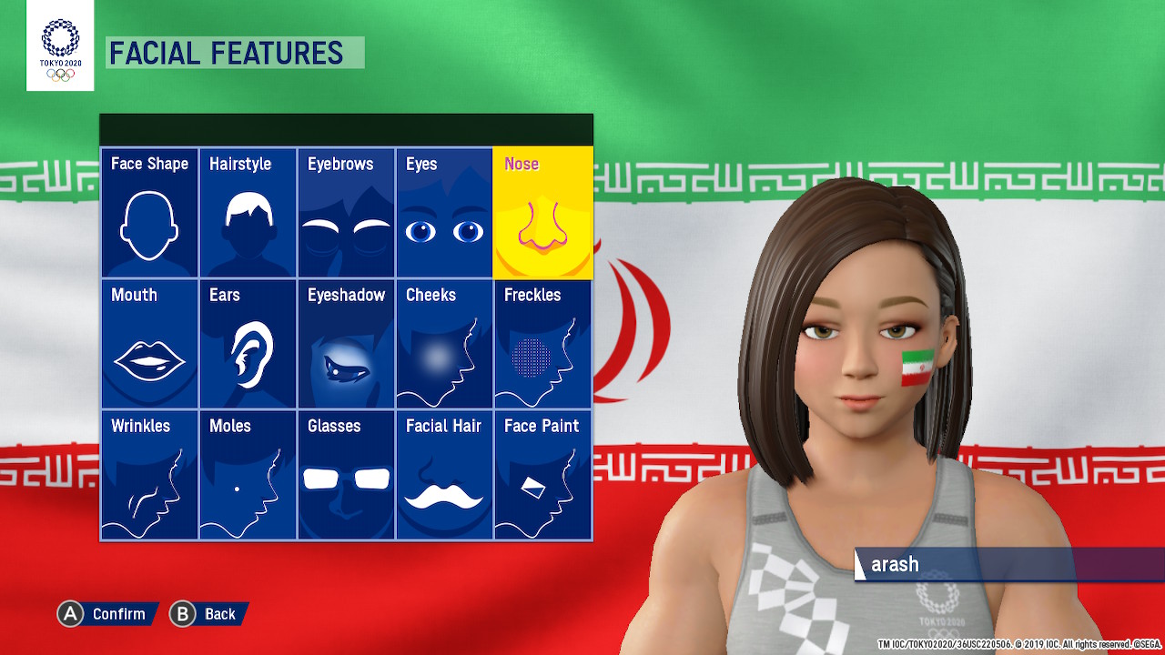 بخش Customize کاراکترها از تمامی بازیهای گذشته المپیکی! دقیقتر و کاملتر بوده و با اینکه هنوز جای کار دارد ولی تقریبا اکثر مواد لازم را مهیا کرده است. گستره انتخابی شما از گزینش جنسیت و رنگ پوست شروع میشود تا ریزترین جزییات مانند البسه ورزشکاران و حتی خالکوبی پرچم ملل روی صورت آنها پیش میرود. تقریبا تمامی کشورهای قارهها در بازی حضور دارند و خوشبختانه ایران در بازی جدید سگا تحریم نشده و میتوانیم با انتخاب آن، ایران را در المپیک ۲۰۲۰ به قهرمانی برسانیم. نکته جالب اینکه بازی به صورت پیشفرض برای افراد حاضر در تیم هر ملت اسامی انتخاب کرده و برای ایران نیز اسامی مانند: تهرانی، همایون (البته به اشتباه برای یک دختر ایرانی این اسم در نظر گرفته شده!)، پارسی، محسن و... در نظر گرفته شده است. این اسامی البته قابل تغییر هستند اما به این نکته ریز تیم سازنده باید تبریک گفت.