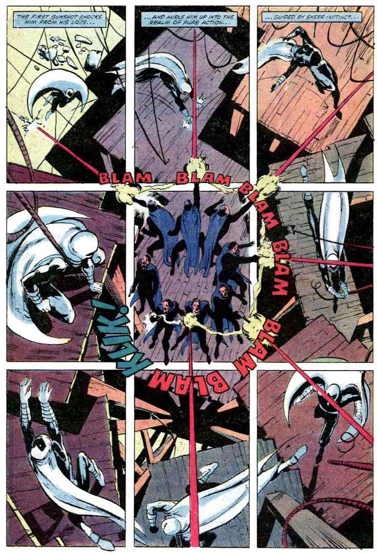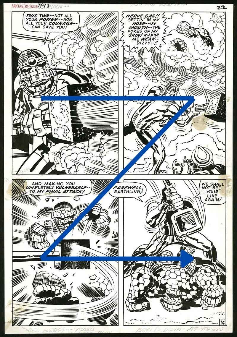در مثال زیر، یک صفحه از کمیک Moon Knight را می‌بینید که توسط بیل سنکیویچ طراحی شده است. با این که با یک صفحه ۹ پنلی طرف هستیم ولی شکل Z برای آن تعریف نمی‌شود. به جایش، باید حرکت خود مون نایت را دنبال کنید تا به درستی داستان پیش برود.
