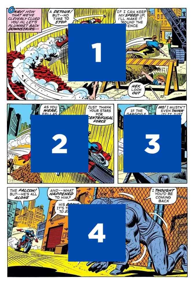 پنل بالایی از کمیک G.I. Joe یک کاراکتر را نشان می‌دهد که در حال باز کردن یک دریچه است. او در میانه تصویر قرار گرفته است و خواننده نیازی چندانی به حرکت چشم ندارد. همین رخداد کوتاه می‌تواند با چند پنل هم به نمایش درآید؛ مثلاً این شخصیت خم شود، سپس در یک تصویر دیگر یک دریچه بازشده به نمایش کشیده شود و بعد از آن کاراکتر دیگر در آن مکان نباشد. همان اتفاق را داریم ولی با شکل متفاوتی از داستان‌گویی.