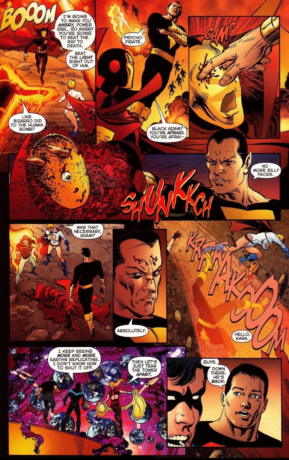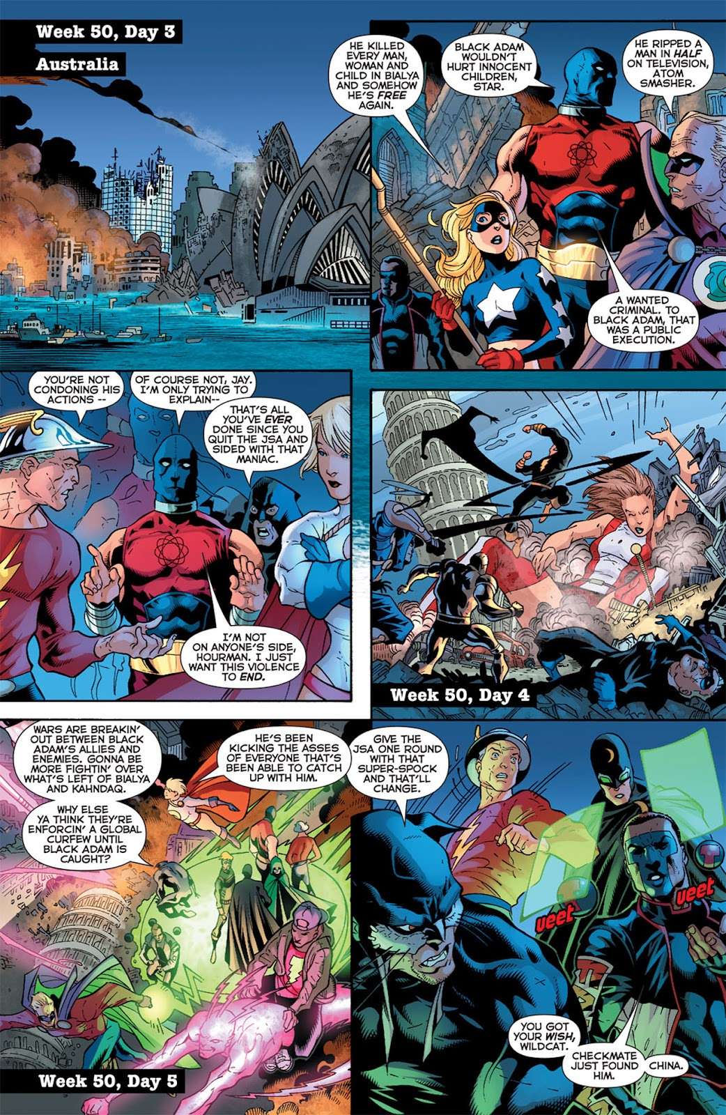 بلک آدام اما در تمام قارهها شروع به نابودی کرد. در مصر، او خانواده مارول را شکست داد و برخی از اهرام بزرگ را در این حین از بین برد. سه روز بعد، آدام با دووم پاترول (Doom Patrol) در ایتالیا جنگید و برج کج پیزا را به زمین ریخت. دو روز بعد، بلک آدام جتهای جنگی چینی را نابود میکرد آن هم در حالی که چین اجازه کمک خارجیها را صادر نمیکردند.