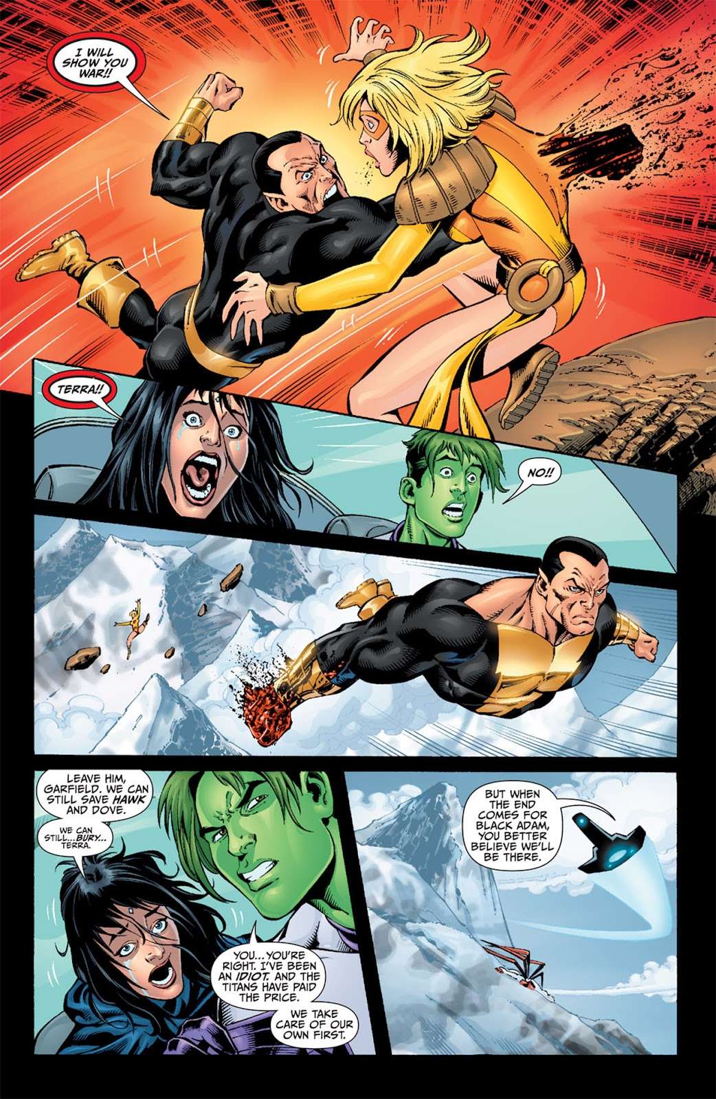 در آخرین روز از رویداد World War III، ترا در کنار چندین گروه از قهرمانان در برابر بلک آدامی که در حال نابودی در چین بود ایستاد. آدام چندین قهرمان را شکست داده بود که در بین آنها هاوک (Hawk) و دوو (Dove) از دوستان ترا را میشد دید. ترا در برابر بلک آدام ایستاد و گفت که میخواهد «جنگ را به سمت او بکشاند» و دو تخته سنگ بزرگ را به آدام کوبید. با این حال این ویلن متوقف نشد و فریاد زد «جنگ رو بهت نشون میدم!» و با یک مشت سینه ترا را سوراخ کرد تا در جا باعث مرگش شود. در حالی که آدام با یک مشت خونین دور میشد، ترا از آسمان سقوط کرد.