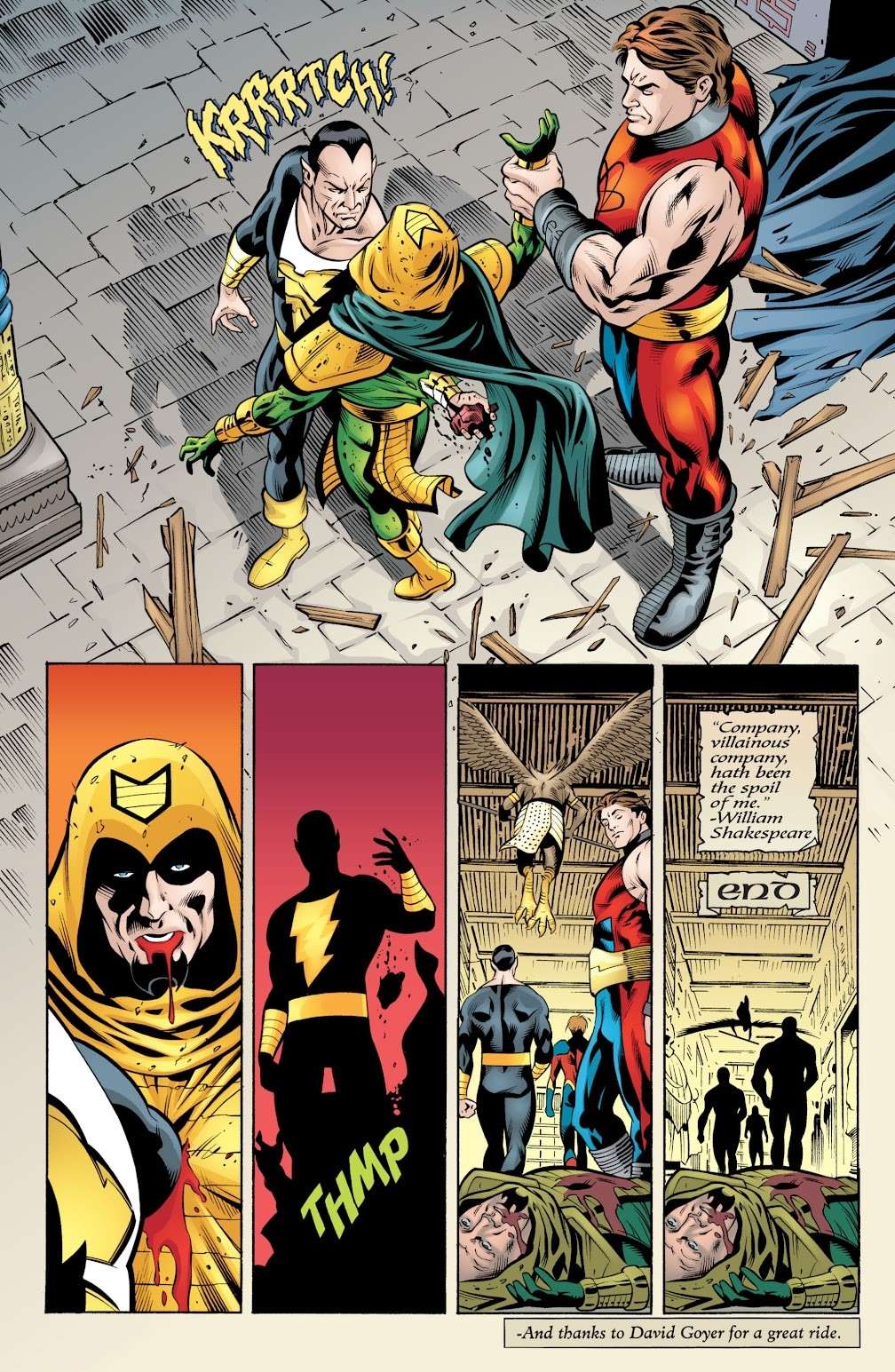 فقط یک روز و نابودی کامل گروه گریت تن طول کشید تا چین نظرش را عوض کند. جامعه عدالت آمریکا، تین تایتانز (Teen Titans)، دووم پاترول و دیگر قهرمانها که در مرز چین منتظر بودند به سرعت به بلک آدام حمله کردند. منتهی بلک آدام داشت پیروز میشد. کاپیتان مارول از خدایان مصری درخواست کرد تا قدرتهای آدام را از او بگیرند ولی آنها از این کار سر باز زدند. با این وجود ایده دیگری به دهن بیلی رسید. او آذرخش جادویی را احضار کرد و آن را نگه داشت. زاتانا (Zatanna) و فانتوم استرنج (Phantom Stranger) آذرخش را به سمت آدام فرستادند و مارول به عنوان نگهبان جادو در آن زمان، کلمه جادویی تث آدام را تغییر داد.