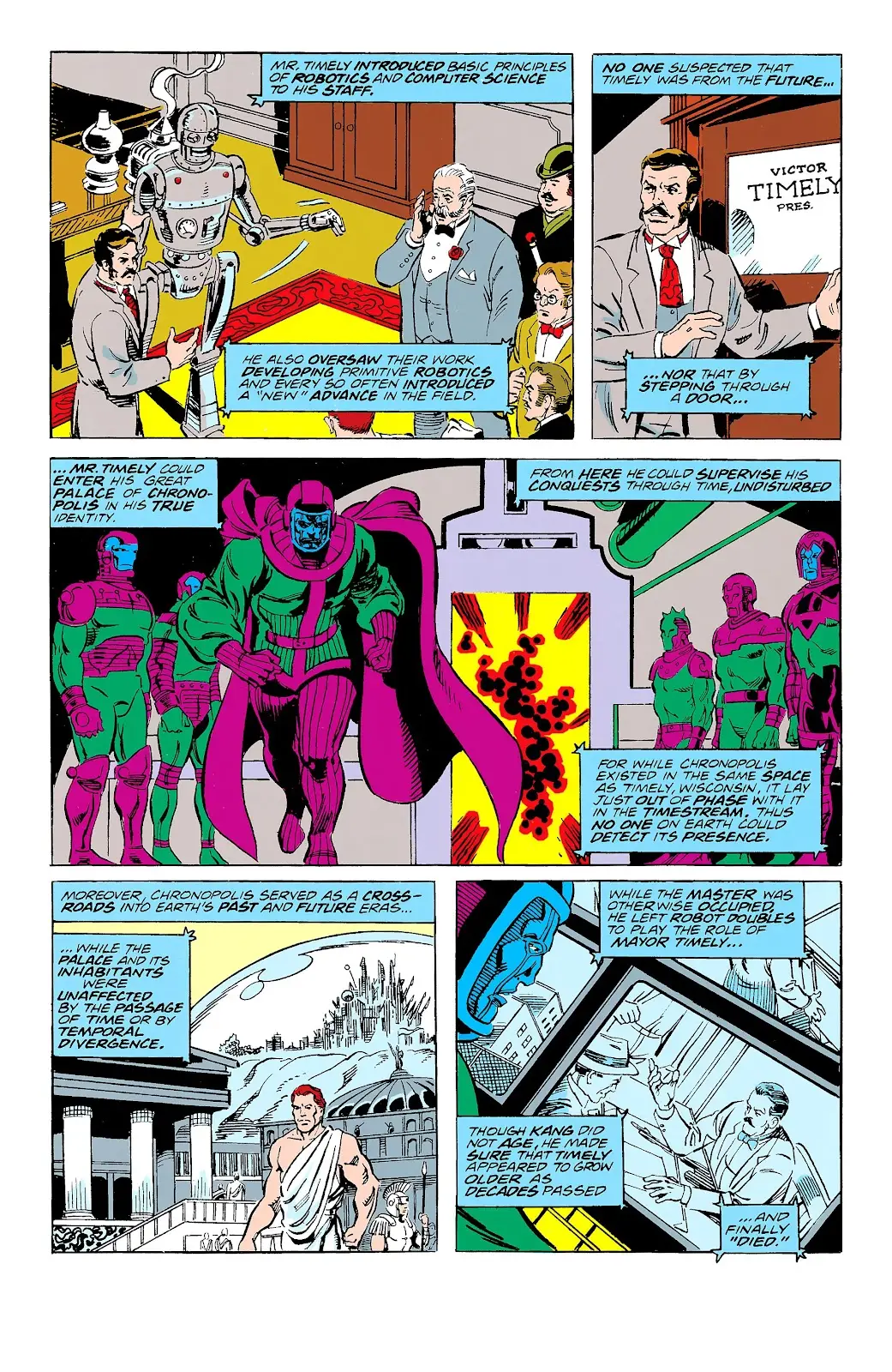 اگر یک مسافر زمان هستید، میتوانید شکیبا باشید و برای طولانی مدت نقشه بکشید. برای همین است که یک کانگ هویت ویکتور تایملی را به خود گرفت. کمابیش یک قرن پیش از دور هم آمدن اونجرز، رد پای این نسخه کانگ روی تکنولوژیهایی که زمان حال را شکل میدانند دیده میشد. او حتی تکنولوژی رباتیکی را معرفی کرد و در نهایت منجر به پدید آمدن نخستین هیومن تورچ (Human Torch) شد! به این ترتیب، خط داستانی Kang Dynasty شکل گرفت؛ به این شکل که بذرهای کاشته شده توسط ویکتور تایملی در گذشته جوانه زدند تا کانگ کنترل سنتینالها (Sentinels) را به دست آورد.