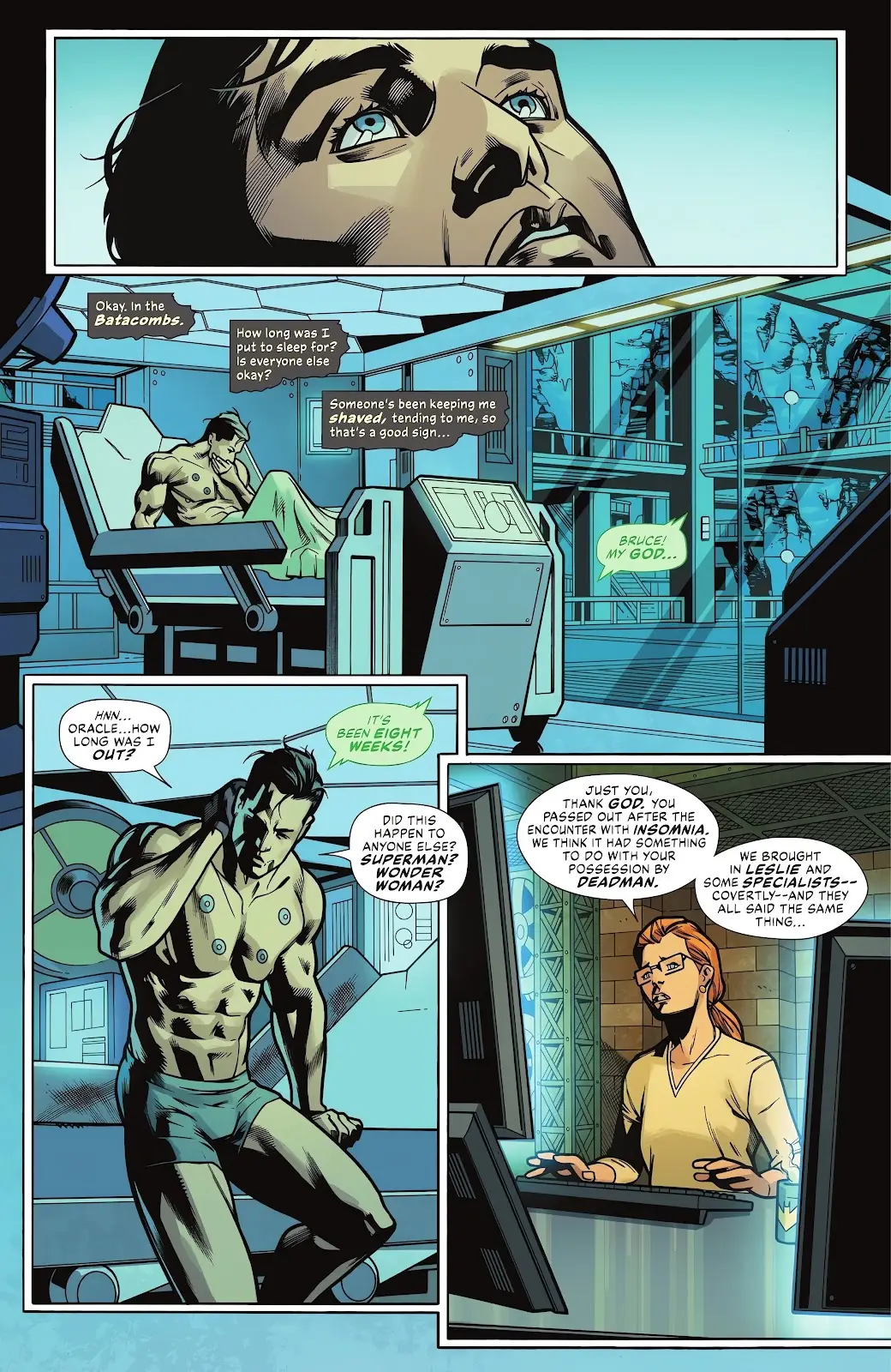 بروس پس از هشت هفته در تخت بودن بیدار میشود و زمان را هدر نمیدهد تا دوباره لباس ویژهی خود را به تن کند و به سمت خیابانها برود. او حتی به اوراکل بازگو نمیکند که چرا دست راستش توسط یک پروتز سایبرنتیک جایگزین شده است.