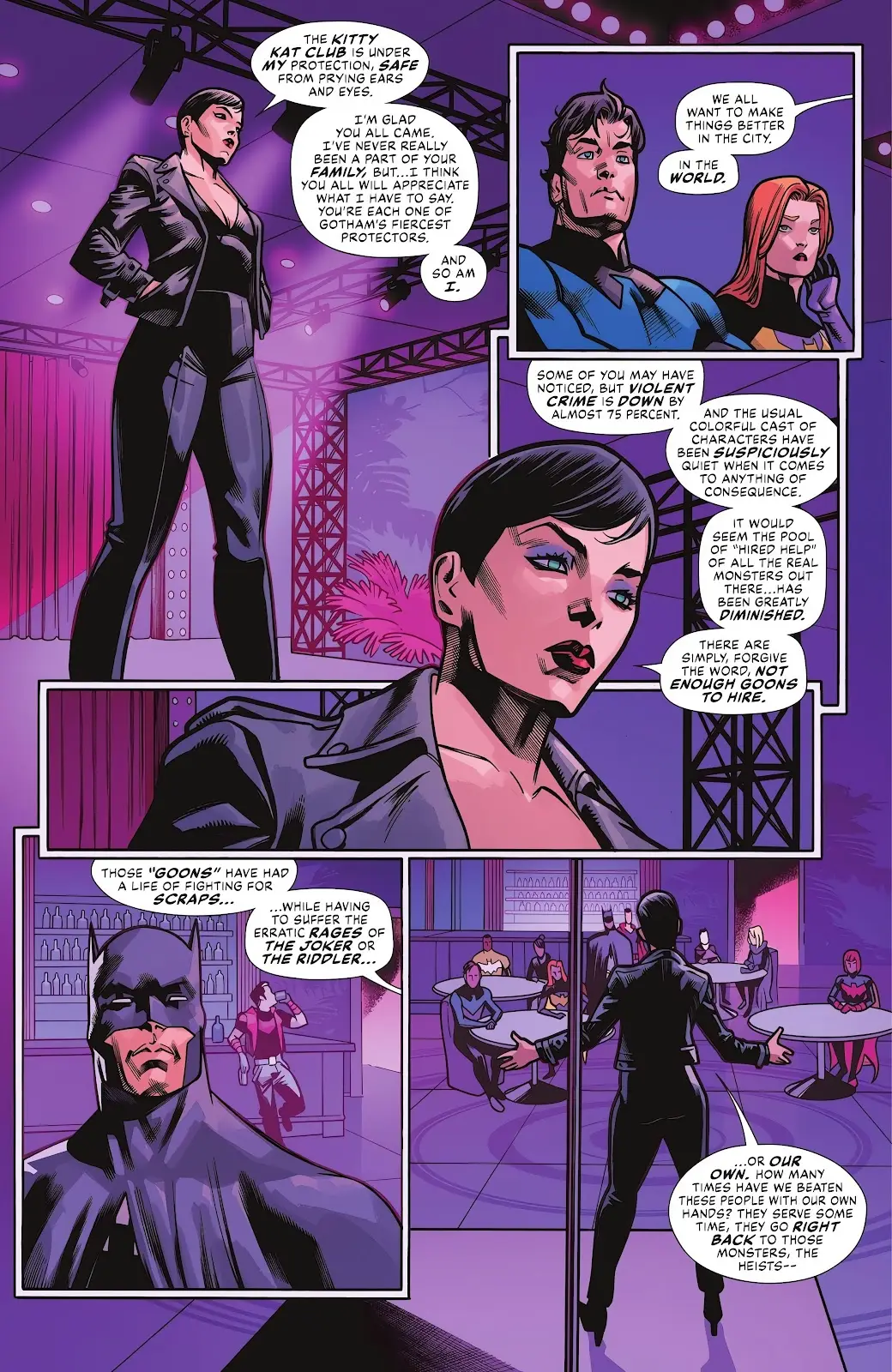 سلینا با دانستن این که امپراتوری جنایت نوپای او قرار است در برابر مهمترین آزمون خود قرار بگیرد، یک جلسه با همهی اعضای بت-فمیلی ترتیب میدهد تا شرایط را بازگو کند که در آن برخی از تبهکاران گاتهام تحمل شوند.