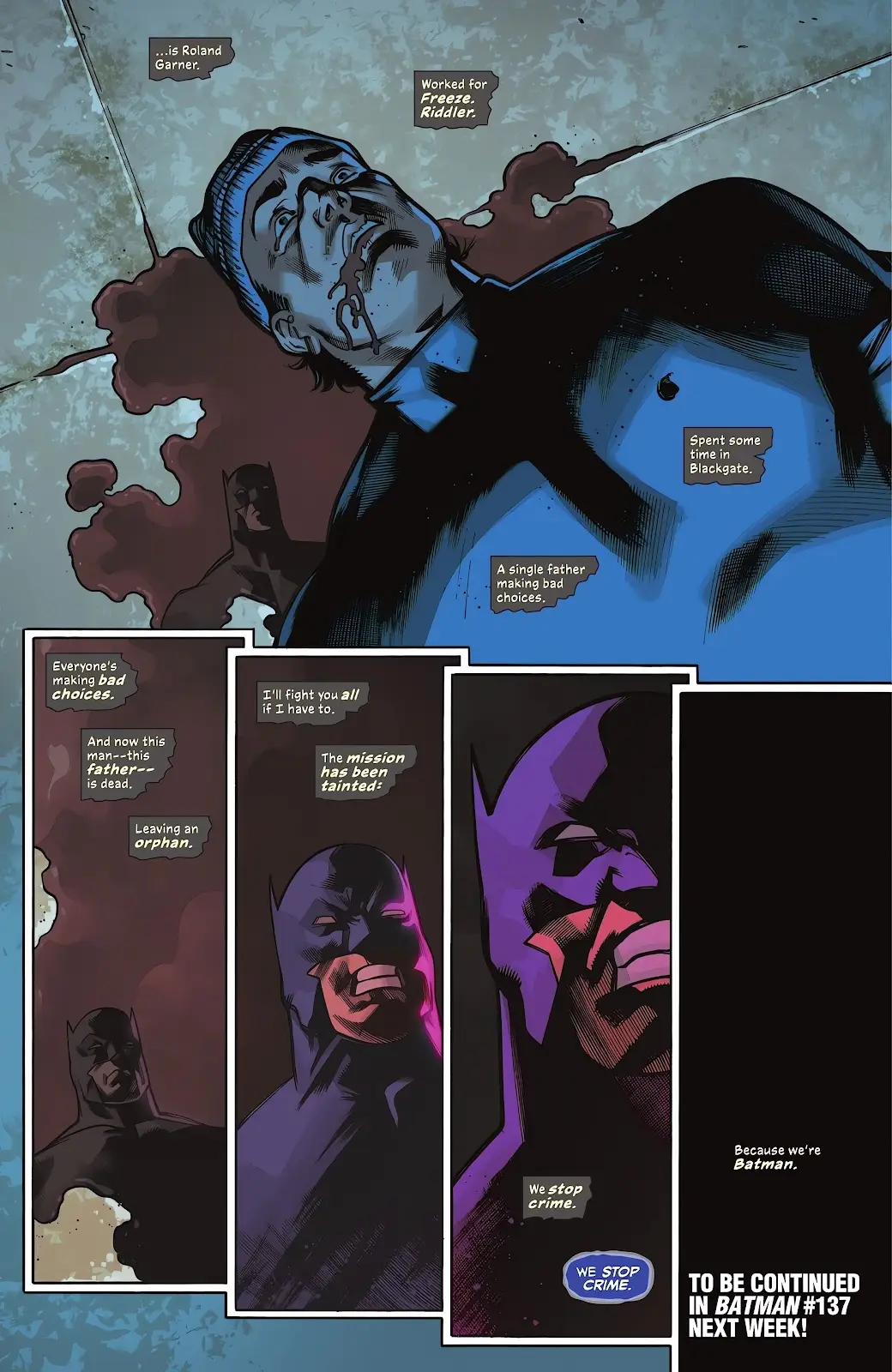 به این ترتیب یک شکاف در بت-فمیلی دیسی پدیدار میشود که بازتابی از جنگ داخلی مارول به نظر میآید. بعضی از شخصیتها در کنار کتوومن قرار میگیرند و این باور را دارند که نتیجه، روش را توجیه میکند اگر در پایان میزان جنایت کاهش یابد. تعدادی دیگر نیز همچون بتمن هستند که نمیخواهند این ایده را بپذیرند که بگذارند برخی جنایات برای رسیدن به هدفی بزرگتر ادامه پیدا کنند.