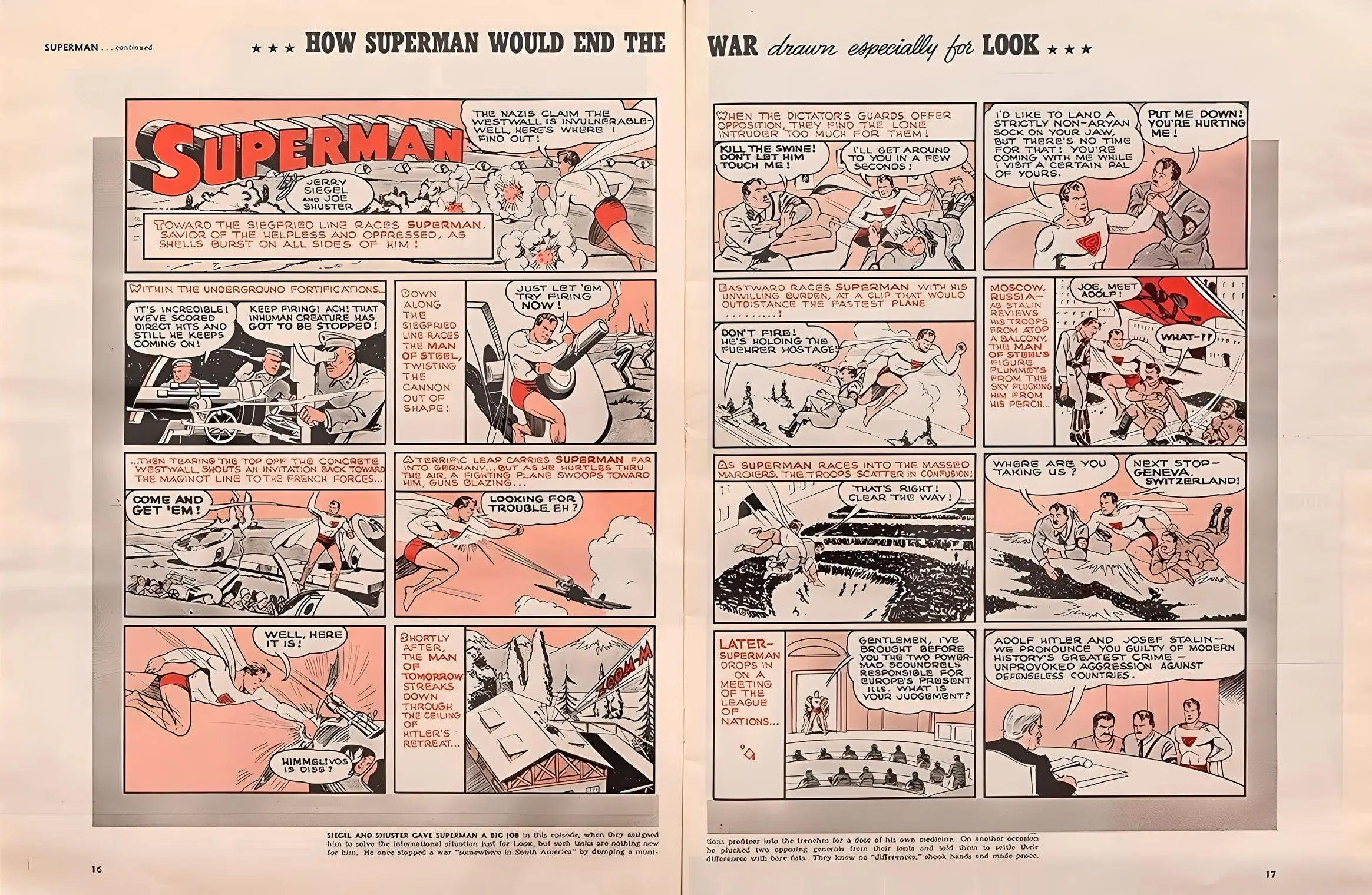در این کمیک، سوپرمن به هیتلر و جوزف استالین (که در آن زمان و پس از پیمان مولوتوف–ریبنتروپ متحد شدند) اعلان جنگ میکند. مرد پولادین از خط زیگفریدِ رسوخناپذیر رد میشود، توپها را همچون نانهای پرتزل خرد و هواپیماها را همانند مگس له میکند، گلوی هیتلر را میگیرد، سپس او و استالین را برای محاکمه برای جرایم جنگی در برابر جامعه ملل به ژنو میکشاند.