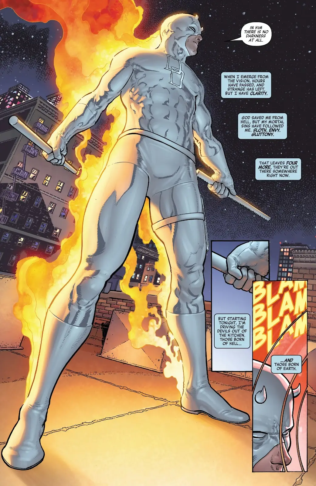 پس از احساس گناه فراوانی که مت به عنوان دردویل تجربه کرد، او در Daredevil سال ۲۰۲۳ دگرگونی کاملی به خود دید و به عنوان یک کشیش آغاز به کار کرد. زمانی که آشکار شد دنیای مارول به یک دردویل نیاز دارد، مورداک به کمک دکتر استرنج عیناً در برابر شیاطین درونیاش قرار گرفت تا خودش را بپالاید و در شمارهی ۶ کمیک Daredevil به آرامش درونی برسد. این قهرمان که توانست در این زمینه پیروز شود، با نسخهای سفیدرنگ از تنپوش کلاسیک خود پا پیش گذاشت تا برای یک بار دیگر به مبارزه با جنایت در خیابانهای هلز کیچن سرگرم شود.