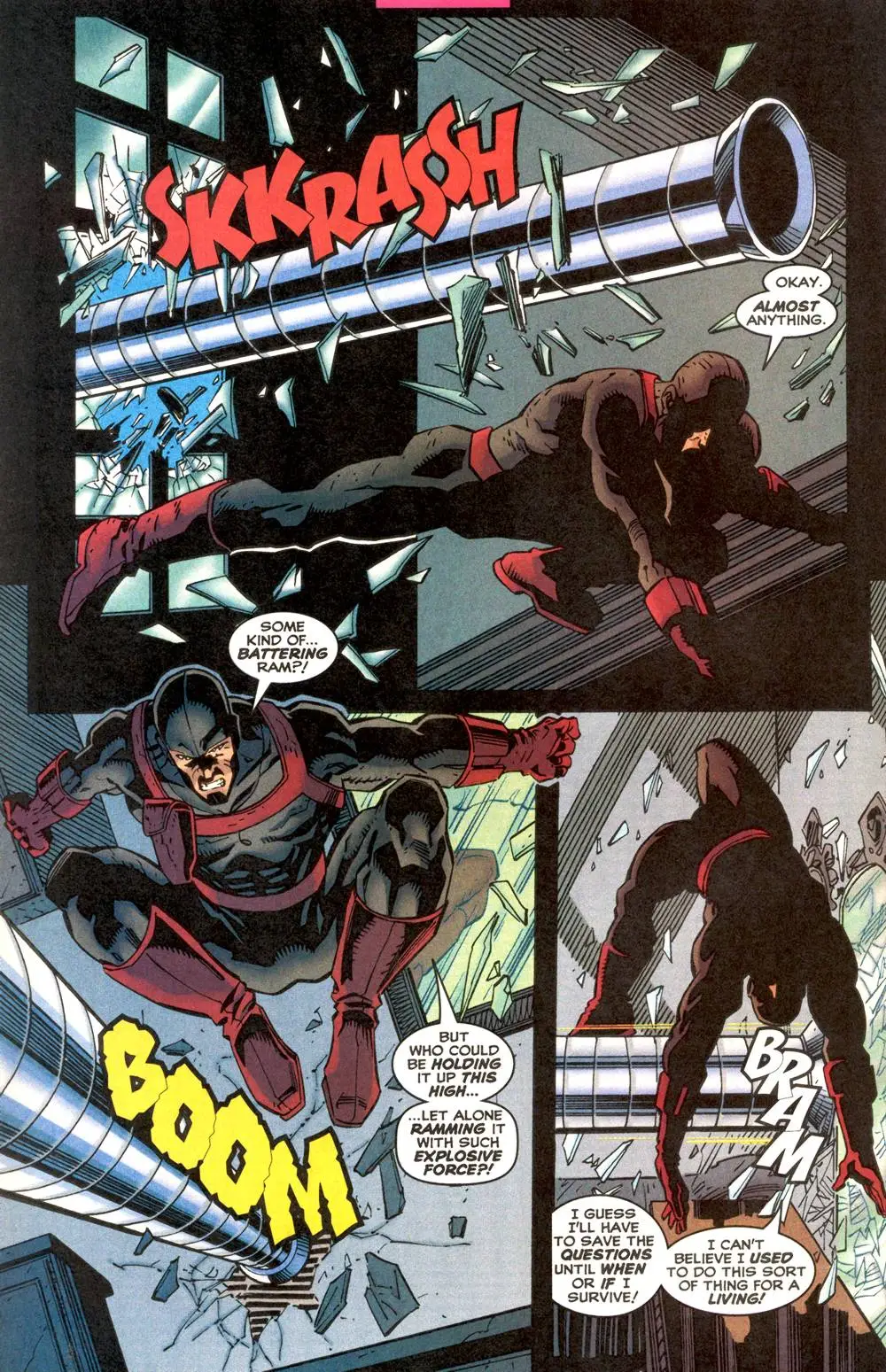 دوران سختی نیاز به اقدامات سخت نیز دارد. بنابراین، زمانی که لباس کلاسیک دردویل از بین رفت او تصمیم گرفت تا در شمارهی ۳۲۱ کمیک Daredevil تنپوش خود را ارتقا دهد و یک پوشش زرهی مشکی را برگزیند. این تنپوش زرهی بیشتر سیاهرنگ است ولی بخشهایی همچون سینه، دستکش و چشمان قرمزرنگ هستند. روی شانههای مت مورداک قسمتهای زرهی فلزی افزوده شد و جای باتونها روی مچ دردویل رفتند. با این که تنپوش زرهی اجازه میداد تا مت در برابر دشمنان مرگباری همانند ونوم قرار بگیرد ولی دردویل احساس میکرد این تغییر پوشش تأثیری منفی روی سلامت روانش داشت تا دوباره به لباس قرمز کلاسیکش بازگردد.