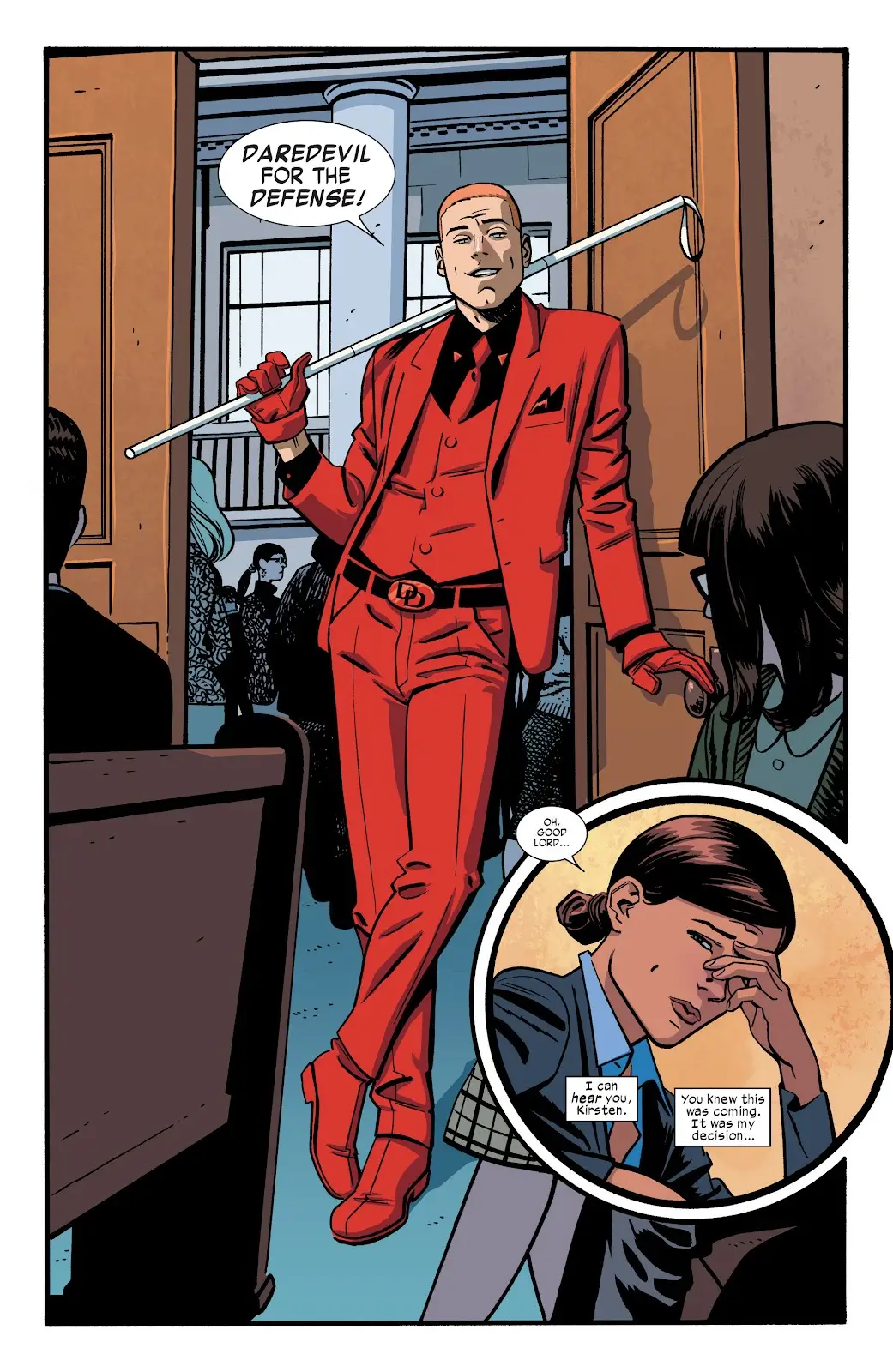 از شمارهی ۷ کمیک Daredevil به پیش، مت به سراغ پوشش کلاسیک خود رفت: یک تنپوش تنگ قرمز با نقابی همرنگ. این لباس برای دههها تبدیل به یونیفرم استاندارد قهرمانی او شد. به جای داشتن یک D رو سینهاش همچون پوشش آغازین، لباس تازهی مت مورداک یک DD با استایل ویژه را روی بخش بدنهی تنپوشش داشت. جای غلاف باتونها هم بر روی ران چپ دردویل باقی ماند تا هنگام نیاز به سادگی در دسترس باشند.