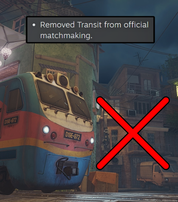 نقشه Transit یکی از چند نقشه جدید بود که در بهروزرسانی اخیر بازی به بازی برای حالت Wingman اضافه شد. این نقشه در خیابانهای ویتنام جریان دارد و بازیکنان میتوانند با استفاده از قطاری متحرک در نقشه، موقعیت خود را تغییر دهند و حریفان را غافلگیر کنند. Transit همراه با نقشه جدید Rooftop برای Wingman و دو نقشه Palacio و Golden برای حالتهای رقابتی، کژوال و دثمچ به بازی اضافه شده بود، اما تنها کمتر از ۴۸ ساعت بعد از انتشار، حذف شد.