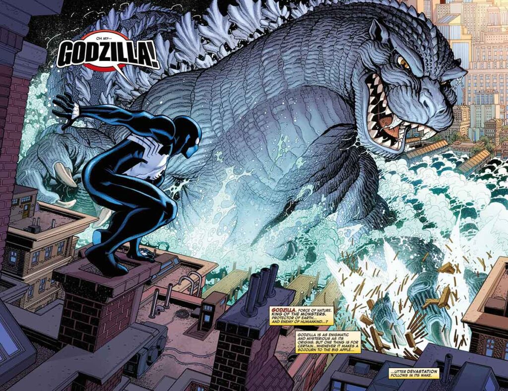احتمالا پیتر پارکر چندان بدشانس هم نباشد که باز هم کلیشه «آشتی دو هماورد با هدف تقابل با یک خطر بزرگتر» ایفای نقش میکند تا مجبور نباشد با گودزیلا بجنگد. رویارویی مرد عنکبوتی و گودزیلا در کمیک Godzilla vs. the Marvel Universe در دورهای روی میدهد که پیتر پارکر به تازگی به لباس سیمبیوتی خود دست پیدا کرده و خبر ندارد که این تنپوش سیاه او در واقع زنده است. همین بهانه خوبی برای همکاری بین اسپایدی و گودزیلا را فراهم میکند.