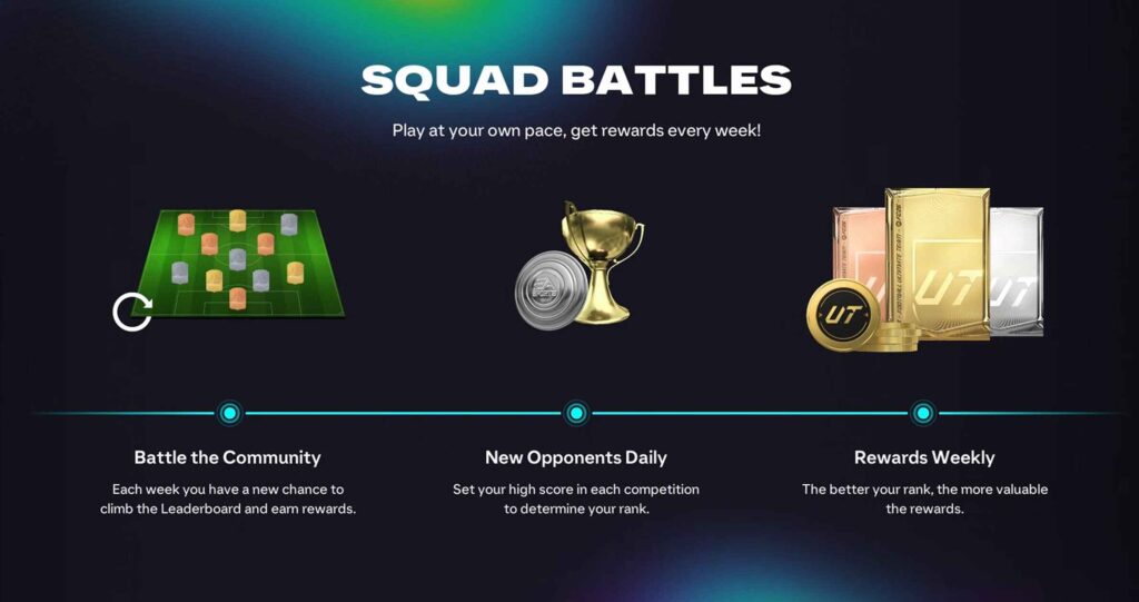 جوایز بخش اسکواد بتلز هر یکشنبه منتشر میشوند و با بازی کردن همه حالتهای موجود، به راحتی میتوانید پکهای قابل معاوضه و چیزی حدود ۱۰۰۰۰ سکه کسب کنید. شاید از تجربه این بخش لذت نبرید، ولی هر هفته به راحتی مقدار قابل توجهی کوین دریافت میکنید. برای تمام کردن این چالشها کافی است روزی یک ساعت وقت بگذارید تا مسابقات اسکواد بتلز تکمیل شوند و جریان قابل توجهی از کوین را به دست بیآورید. همچنین از این پول برای خریدن بازیکنان مخصوص چالشهای SBC هم میتوانید استفاده کنید و حتی کارتهای باارزش هر پک آن را با قیمتهای قابل توجه به فروش برسانید.