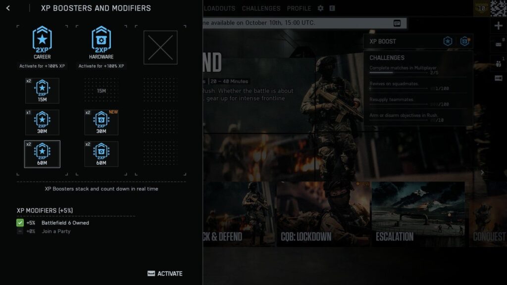 در منوی اصلی، در سمت بالا راست بخش انتخاب مود میتوانید قسمتی به نام XP Boost پیدا کنید. اگر روی این قسمت کلیلک کنید منویی دیگر پر از تقویت کنندههای XP و Modifierها باز میکنید که از آنها را طریق تکمیل چالشهای مختلف مانند زنده کردن همتیمیها، رساندن مهمات به تیم یا خنثی کردن آبجکتیوها در Rush بدست آوردهاید.