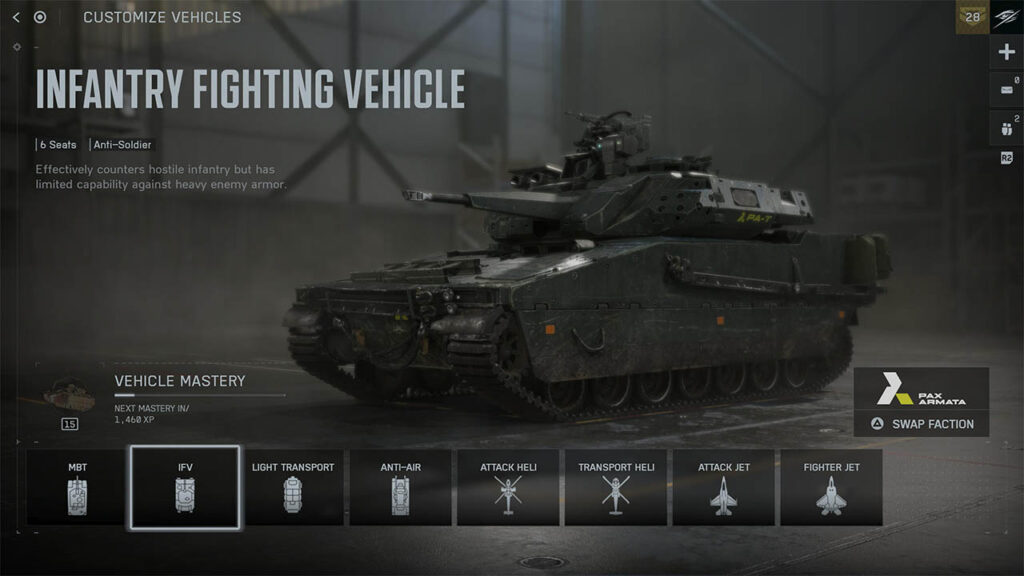 IFVها در تاکتیکهای اذیت کردن زرههای سنگین میدرخشند. از Armor-Piercing Shells همراه با Lock-Guided Missiles استفاده کنید تا با تانکها از فاصلهای امن درگیر شوید و سپس با استفاده از Thermal Blocking Smoke خود را مخفی کنید. Counter-Fire Radar بلافاصله هرکسی که به شما دمیج وارد کند را مشخص میکند و اجازه اجرای ضدحملهای بینقض را میدهد.