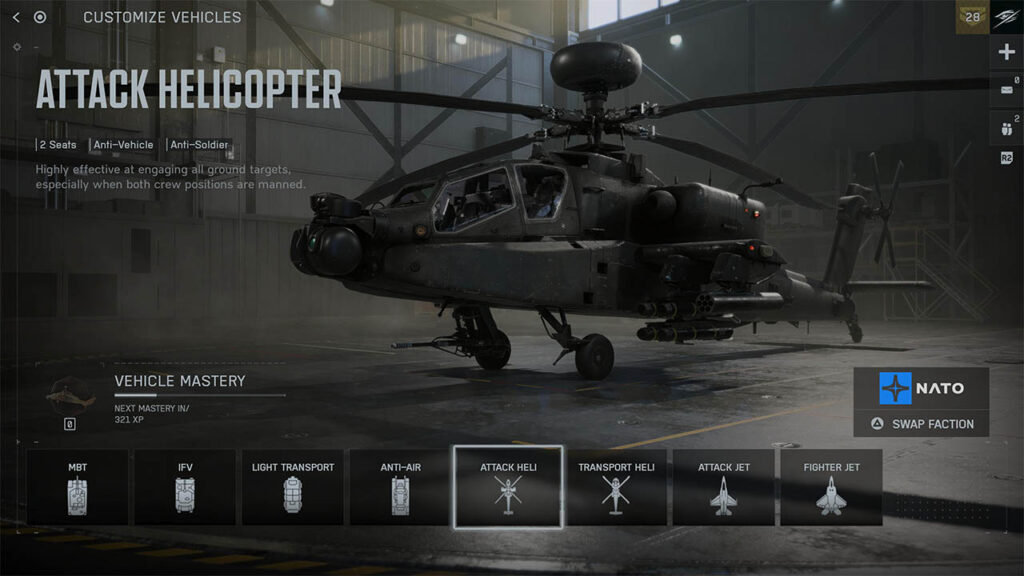 هلیکوپترهای جنگنده مانند M77E Falchion و Panther KHT در حملات دقیق علیه گروههای دشمن روی زمین فوقالعاده عمل میکنند. برای عملیات مقابله با وسایل نقلیه زرهدار از Heavy Rockets برای بدست آوردن بیشترین دمیج در هر شلیک استفاده کنید و آن را با Aim-Guided Missiles برای افزایش محدوده درگیری، ترکیب کنید.