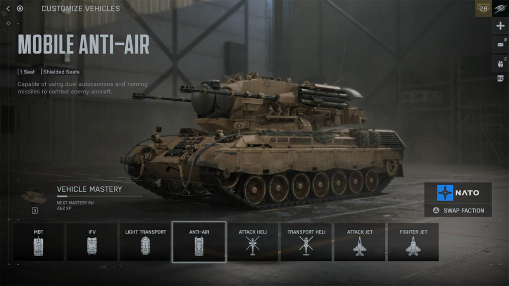 ماشینهای Mobile Anti-Air به عنوان پایه دفاعهای هوایی عمل میکنند و به دو توپ خودکار و موشکهای هدایت شونده طراحی شده برای شکار هواپیماها مجهز هستند. تانکهای Cheetah 1A2 و GE-26 PAX عملکردی یکسان با تجهیزات مخصوص برای سناریوهای مختلف دارند.