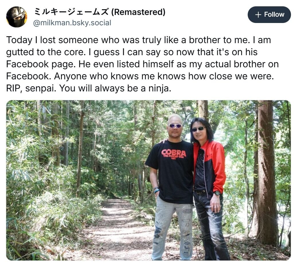 امروز کسی را از دست دادم که واقعا مثل برادرم بود. قلبم شکسته است. حالا که این موضوع در فیسبوک او اعلام شده میتوانم بگویم حتی خودش مرا در آنجا به عنوان برادر واقعیاش ثبت کرده بود. هر کسی که مرا بشناسد میداند چقدر به هم نزدیک بودیم. آرام بخوابی سنپای، تو همیشه یک نینجا خواهی بود.