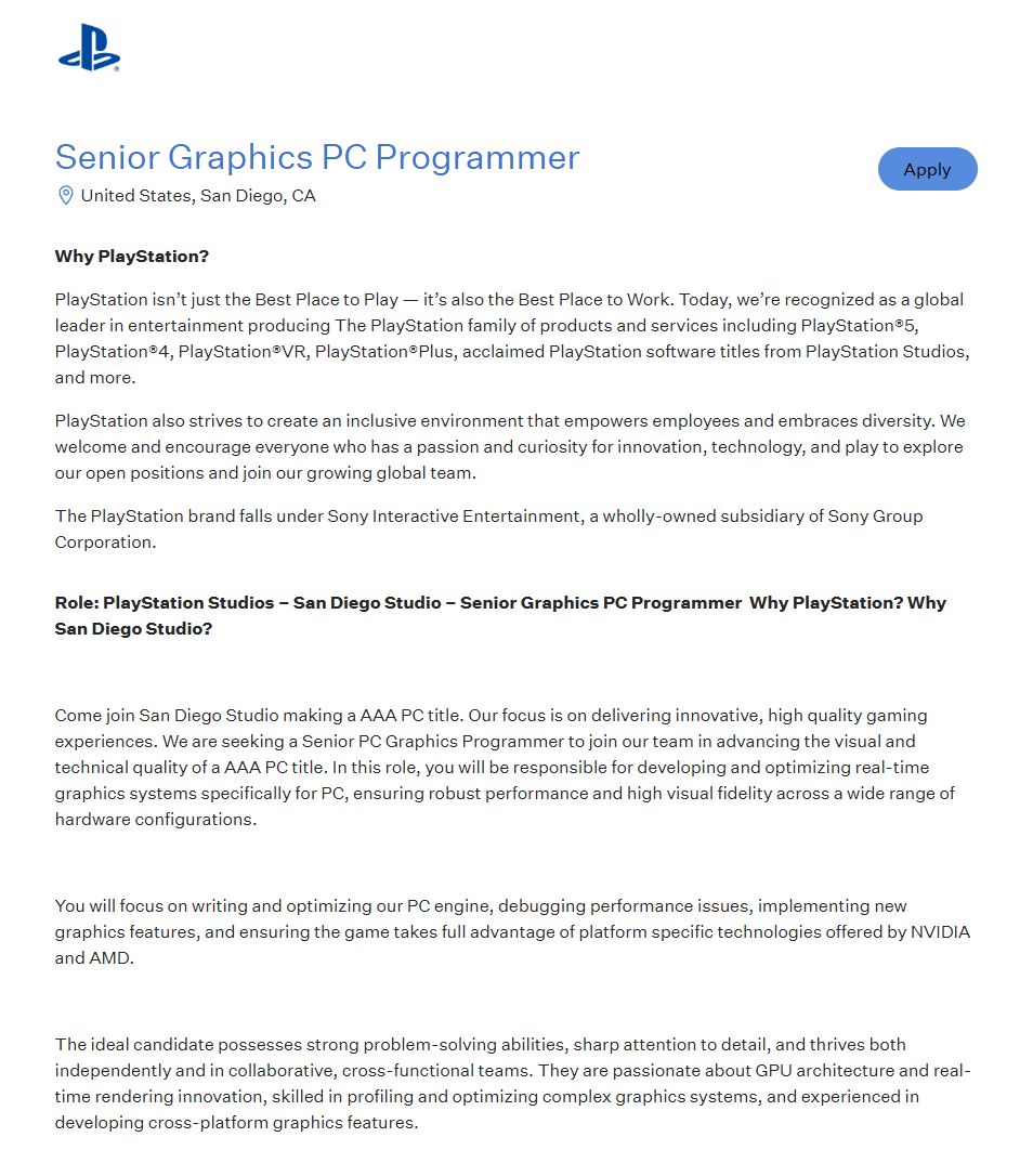 استودیوی Sony San Diego به دنبال جذب یک برنامهنویس ارشد گرافیک برای رایانههای شخصی است تا روی یک «بازی AAA برای پیسی» کار کند. جزئیات بیشتری درباره ماهیت این پروژه ارائه نشده و توضیحات آگهی بیشتر به وظایف شغلی مانند بهینهسازی گرافیک در زمان واقعی و ارتقای موتور داخلی برای رایانههای شخصی پرداخته است.