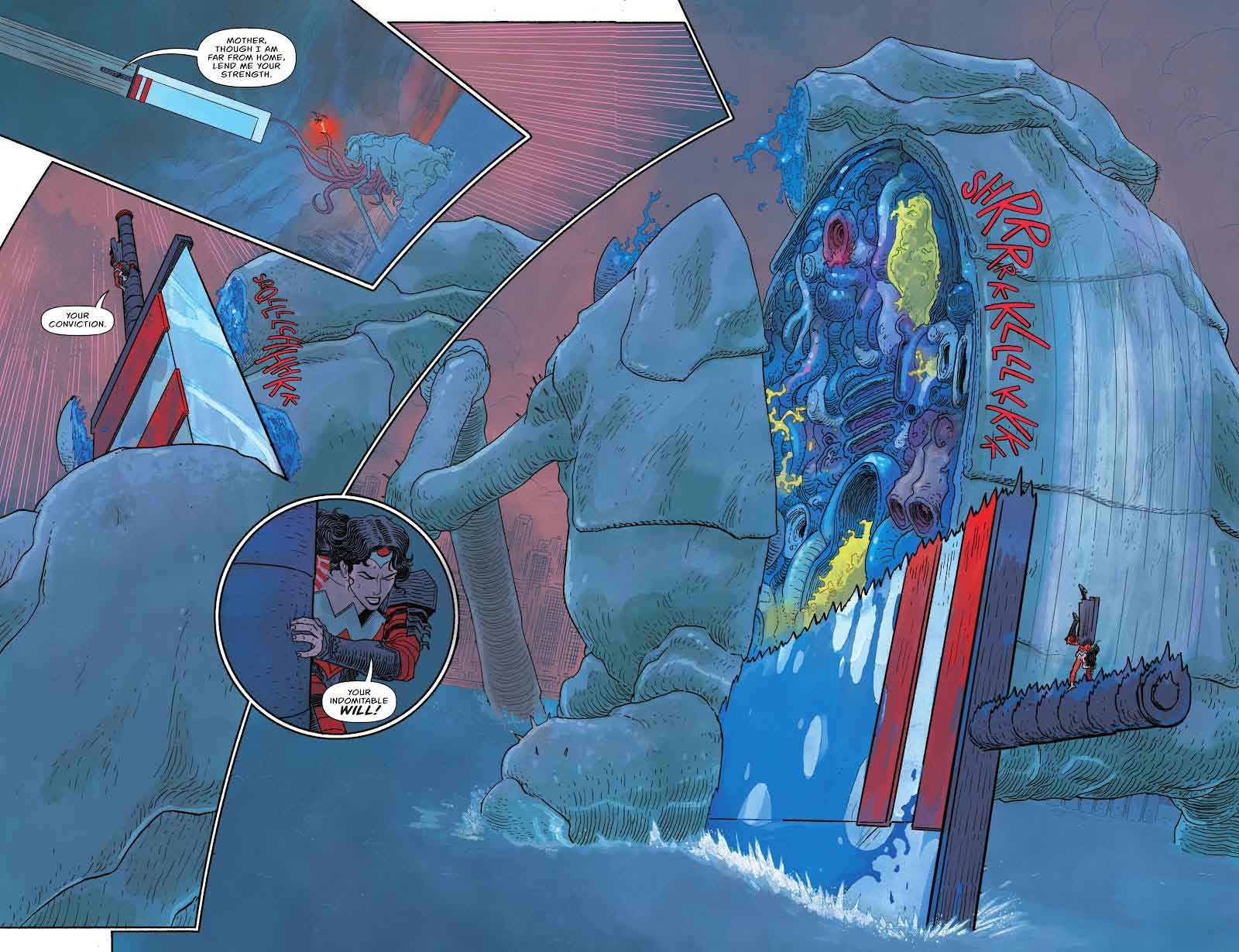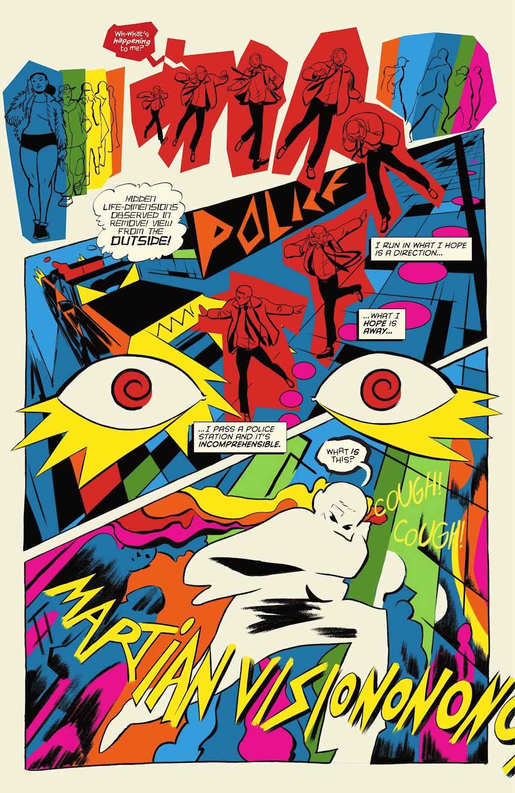 انتخاب یک لحظه ثابت از Absolute Martian Manhunter کار دشوار به نظر میرسد؛ چرا که کل این سری حول محور یک سفر ذهنی روانگردان میچرخد که میتواند مخاطبان را گیج، سرگرم و مسحور کند. دو شماره اولیه این سری نمایی آشکارتر هستند که در آن خود جان جونز تلاش دارد تا احساسات جدیدش و چیزهای نو و نادیدهای که درک میکند را بفهمد.