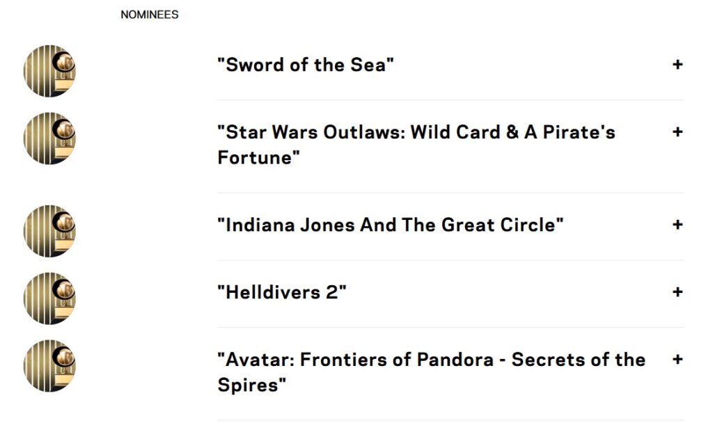 حضور Helldivers 2 در این لیست با وجود انتشار بازی پیش از دوره زمانی واجد شرایط (آگوست ۲۰۲۴ تا ۲۰۲۵ میلادی)، به خاطر انتشار دیرتر آلبوم موسیقی متن آن از زمان عرضه بازی صورت گرفته است.