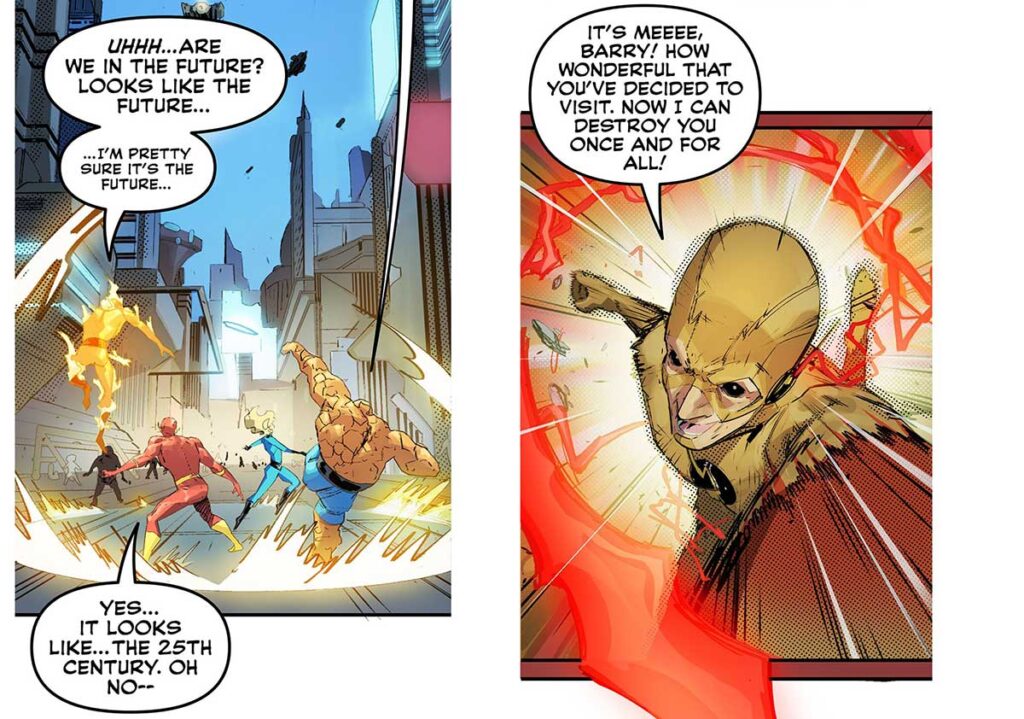 با همه محدودیتهای یادشده، انتظار از یک ماجراجویی بزرگ و دیوانهوار دور از واقعیت خواهد بود. عنوان DC/Marvel: The Flash/Fantastic Four نیز چندان بلندپروازی نمیکند و یک روایت جمع و جور و کوچک را به نمایش میکشد. پسزمینه خاصی برای این کراساوور روایت نمیشود و ناگهان به دل داستان میافتید. ماجرا هم یک درگیری نسبتا ساده بین ویلنهای فلش با بری آلن و چهار شگفتانگیز به حساب میآید که در صفحات محدودی که دارد کم و بیش به خوبی خواننده را دنبال خود میکشاند و یک پایان مورد قبول را تحویل میدهد.