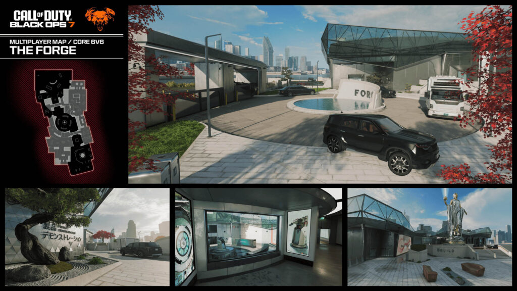 یک نقشه متوسط دیگر بازی بلک آپس 7، The Forge نام دارد. این منطقه جایی است که اکثر تحقیقات شرکت The Guild و توسعههای تکنولوژی آن اتفاق میافتند. مپ فورج که در یک بندرگاه ساخته شده در ابتدا با تبلیغات متعدد محصولات و یک لابی مدرن که سلاحهای اتوماتیک شرکت را نشان میدهد، مکانی برای استقبال از مشتریهای این شرکت به نظر میآید. دو ساختمان مجزا در The Forge وجود دارند که از طریق راهروها به یکدیگر متصل میشوند، این در حالی است که مرکز نقشه دیوارهای چرخشی دارد و پوشش متغیر برای بازیکنان مهیا میکند. فورج یکی از نقشههایی است که از لحاظ داستانی ارتباطات مستقیم با کمپین بازی Call of Duty Black Ops 7 دارد.