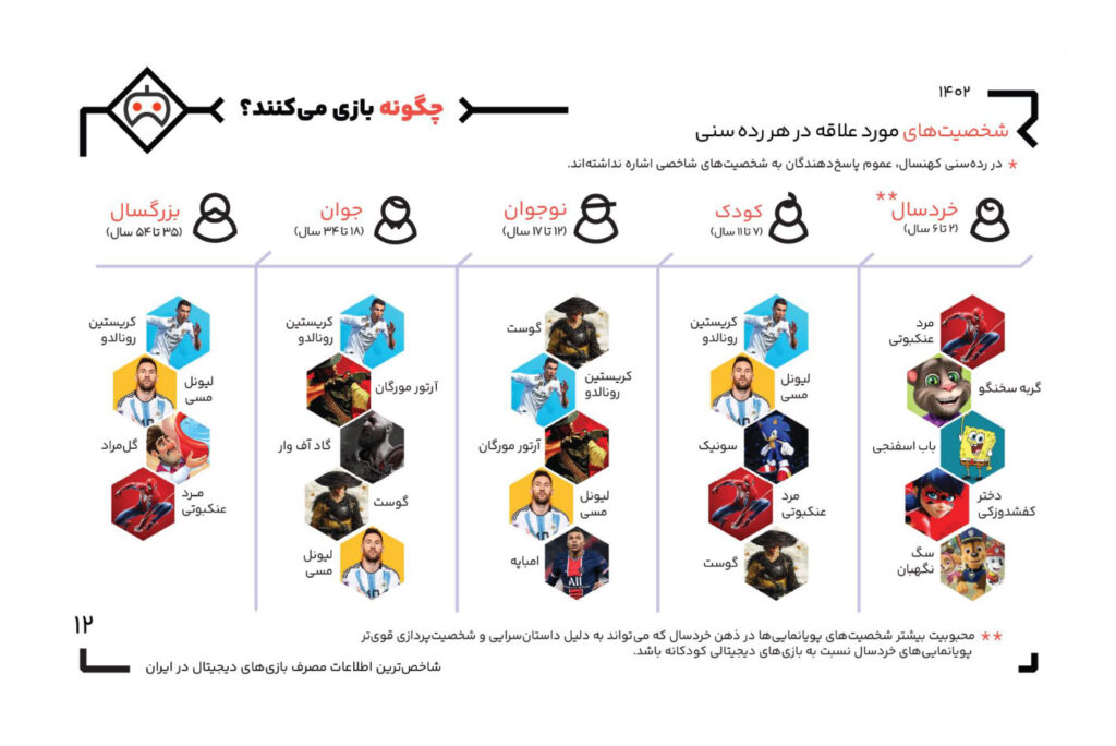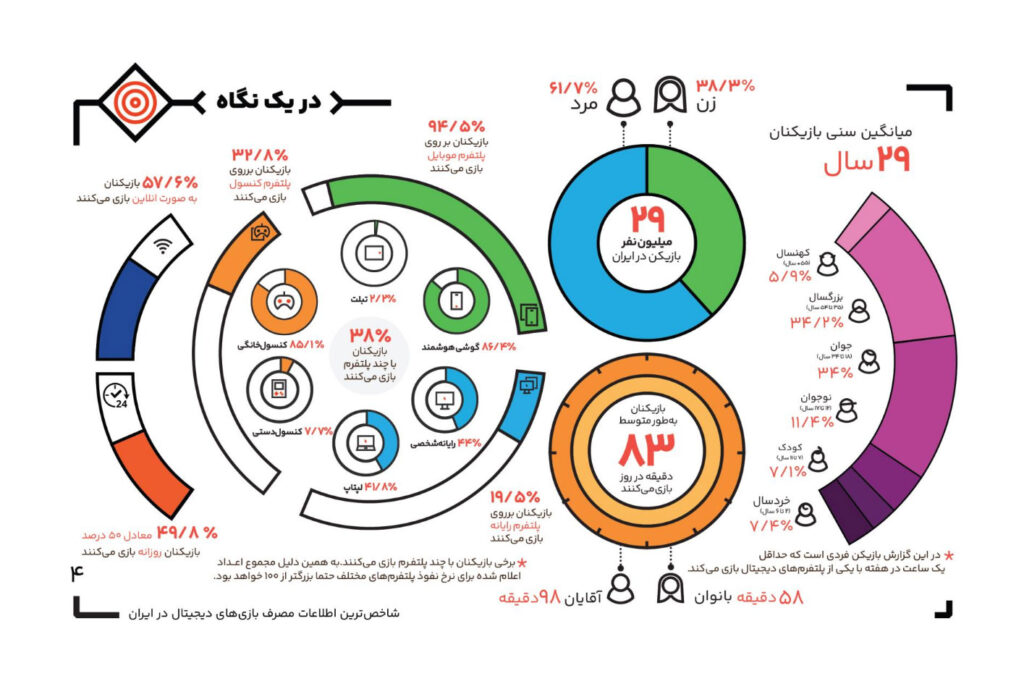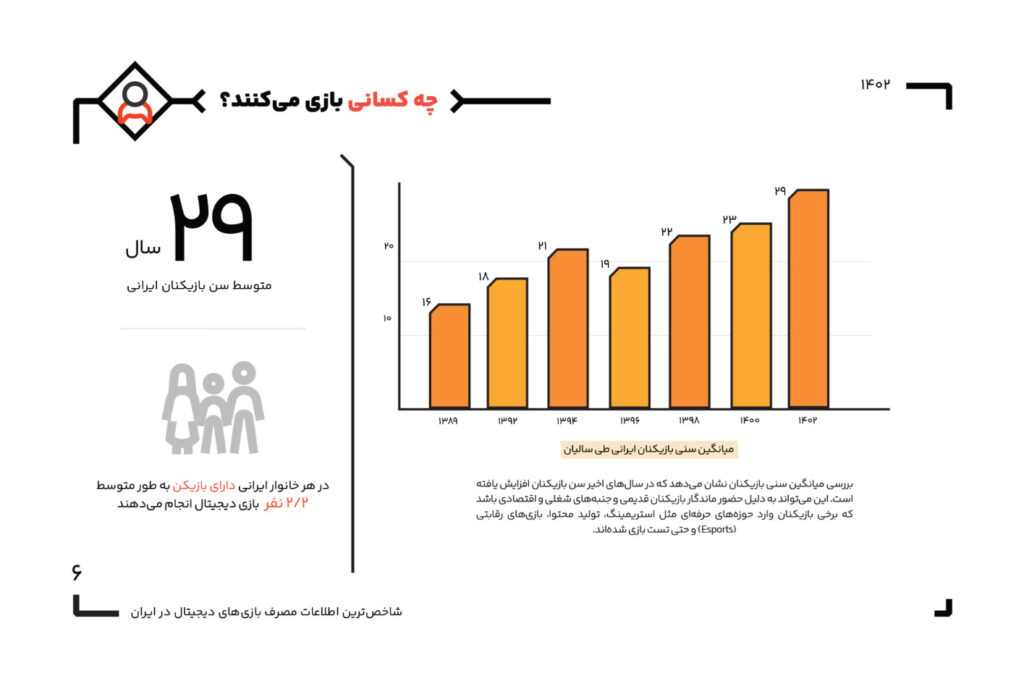 میانگین سنی گیمرهای ایرانی هم در این سال با افزایش قابل توجهی همراه بوده و از ۲۳ سال در ۱۴۰۰ به ۲۹ سال در ۱۴۰۲ رسیده است. بر اساس تفکیک جنسیت هم از ۱۰۰ مرد ایرانی ۴۲ نفر و از هر ۱۰۰ زن ایرانی ۲۷ نفر گیمر هستند. همچنین در هر خانوار ایرانی دارای عضو گیمر، به طور متوسط ۲.۲ نفر سراغ بازیهای ویدیویی میروند. جامعه گیمرها در ایران به طور متوسط ۸۳ دقیقه در روز بازی میکنند که این زمان برای آقایان ۹۸ دقیقه و برای خانمها ۵۸ دقیقه در روز است.