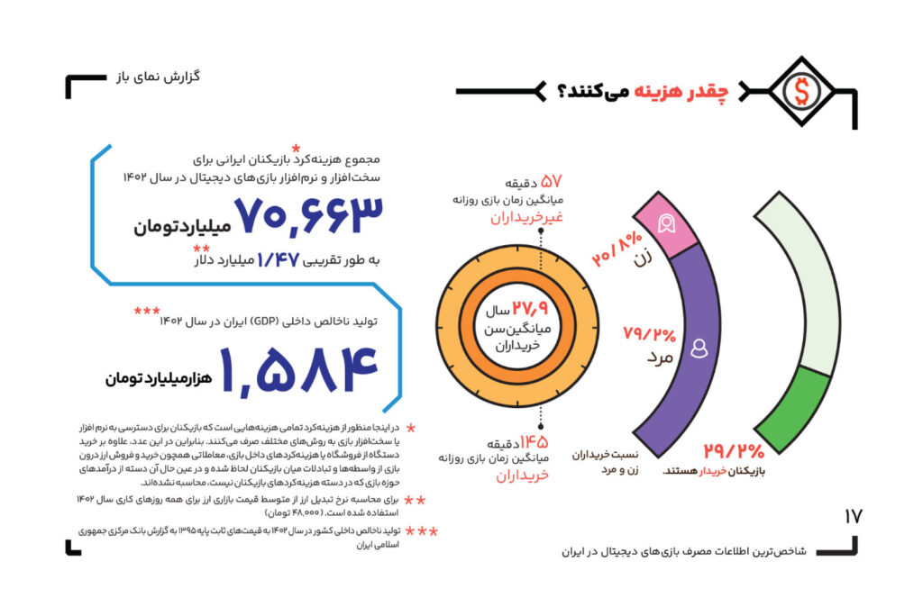 اما به یکی از جالبترین بخشهای گزارش نمای باز ۱۴۰۲ میرسیم که مربوط به میزان هزینه گیمرهای ایرانی در این سال است. طبق این گزارش، مجموع هزینهکرد بازیکنان ایرانی برای سختافزار و نرمافزار بازیهای دیجیتال در سال مذکور، رقم قابل توجه ۷۰ هزار و ۶۶۳ میلیارد تومان است. برای مقایسه باید گفت که ارزش تولید ناخالص داخلی (GDP) ایران در همان سال ۱۵۸۴ میلیارد تومان بود.