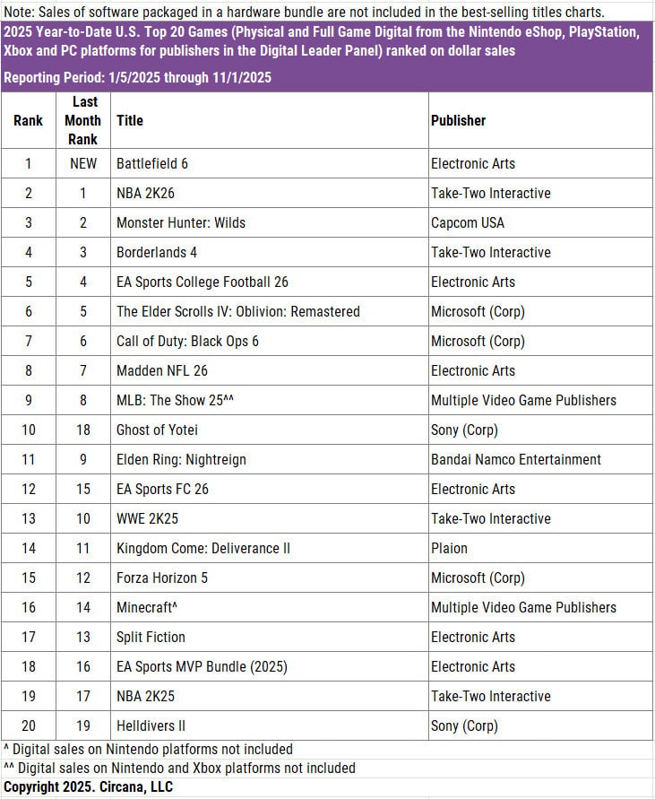 این عنوان بر اساس گزارش رسمی Circana از فروش بازیهای ویدیویی در ایالات متحده در ماه اکتبر مطرح شده که در آن «مت پیسکاتلا» مدیر ارشد این موسسه تایید کرد Battlefield 6 «پرفروشترین بازی سال ۲۰۲۵ تا امروز» بوده است.
