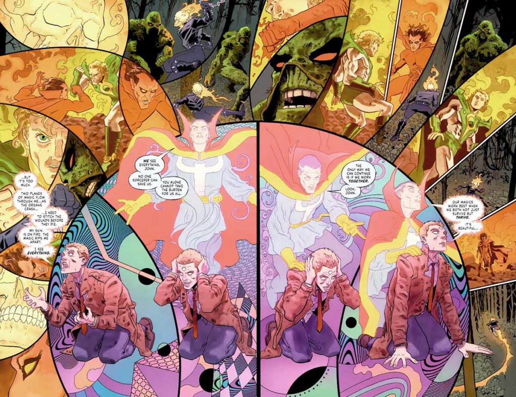 کنار هم قرار دادن این دو کاراکتر فرصت جالبی را برای مقایسه آنها ایجاد میکند. البته این پنجره بازشده کوچک است و اجازه مانور زیادی به اسامی برجسته اسکات اسنایدر، جیمز تینیون چهارم و جاشوا ویلیامسون داده نمیشود تا از پتانسیل کنستانتاین و استرنج بهره ببرند. برای همین، همراهی این دو شخصیت چندان ژرف نمیشود و فقط به شکلی سطحی به نمایش درمیآید. هر چند در همین فرصت کم فلسفه آنها و حتی فرای این کاراکترها، فلسفه نگاه فراگیر که روی هر کدام از دنیاهای دیسی و مارول حس میشود مورد کند و کاو قرار میگیرند.