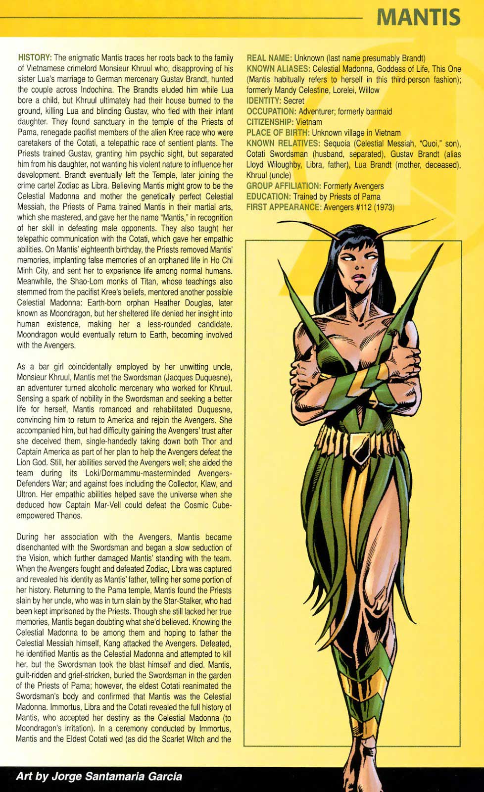 شاید جالبترین نکته در بین همه این انتقالها این باشد که انتشارات مارول، نگارشهایی از مانتیس که توسط دیگر ناشران عرضه شدهاند را پذیرفته است. اگر به عنوان Official Handbook of the Marvel Universe: Avengers 2005 که توسط خود مارول منتشر شده است سر بزنید، خواهید دید که هر دو هویت ویلو و لورلی به عنوان دیگر نامهای منتیس ذکر شدهاند.