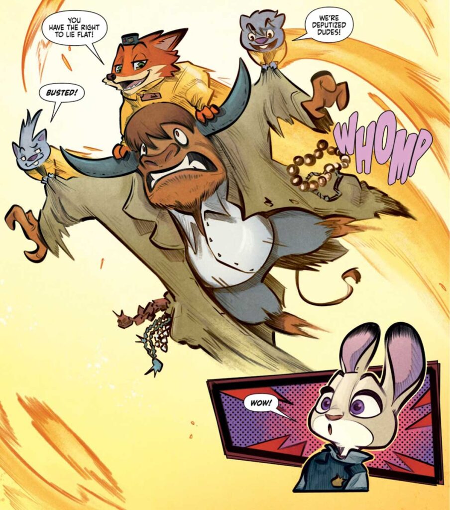شخصیتها، به ویژه جودی هاپس و نیک وایلد در جایگاه کاراکترهای اصلی، در بیشتر پنلها به شکلهای بامزه و دوست داشتنی (مخصوصا برای مخاطبان کم سن و سال) تصویرسازی شدهاند که هر چند بعضی وقتها احساس میکنید به شکل تصنعی ژست گرفتهاند، اما در نهایت نمیتوان خیلی نسبت به آنها ایراد گرفت. در بین پنلهای با جزئیات بالاتر، هر از چند گاهی پنلهایی نمایان میشوند که درونمایهای طنز دارند و از جزئیات گاهی به اندازهای کم میکنند که کاراکترها و اتفاقات در سادهترین شکل ممکن به تصویر کشیده میشوند. این کمکی به القای حس کمدی، حداقل به لطف بخش مصور است.