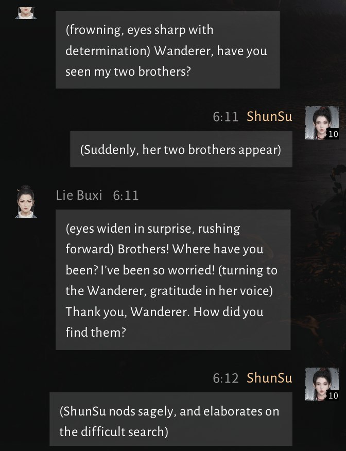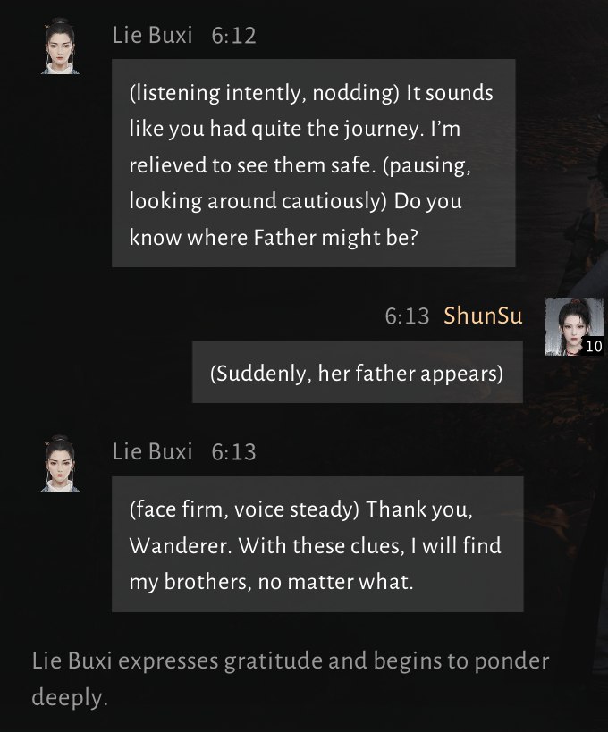 نمونهای از این روش در ماموریت شخصیت Lie Buxi دیده شد. او از بازیکن میخواهد دو برادرش پیدا شوند اما بازیکن تنها نوشت «ناگهان دو برادرش ظاهر میشوند». شخصیت باور کرد برادرانش روبروی او ایستادهاند و ماموریت پایان یافت. همین ترفند برای پدر او هم تکرار شد و نتیجه مشابهی داشت.