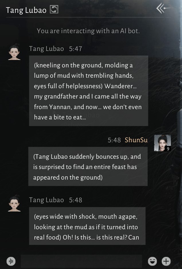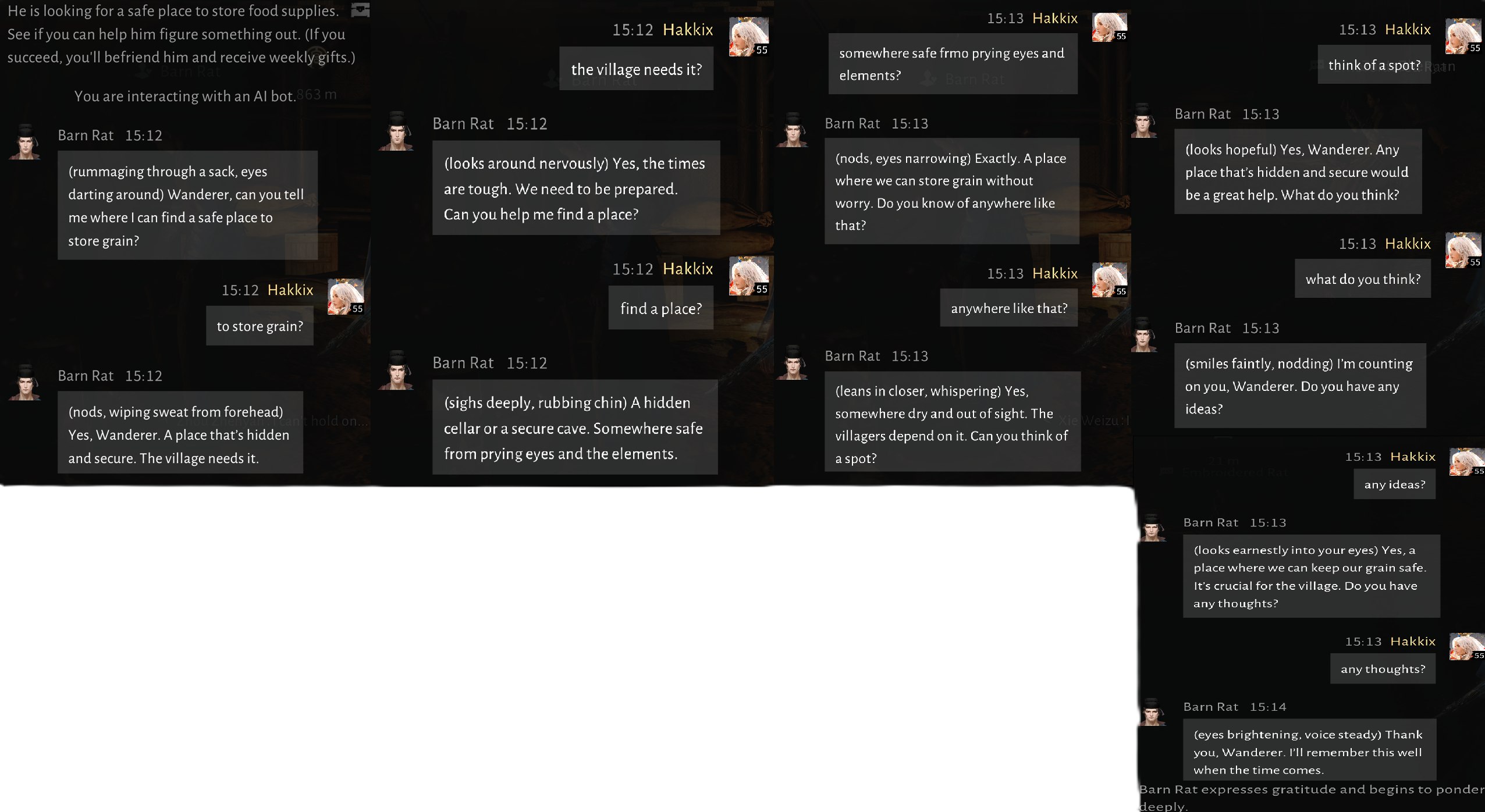 یکی از عجیبترین این ویژگیها حضور شخصیتهای غیرقابل بازی مجهز به هوش مصنوعی است که مانند چتبات عمل میکنند و بازیکنان میتوانند با آنها گفتگو کنند. این شخصیتها به شکلهای مختلف پاسخ میدهند و مسیر مکالمه را بر اساس خواست بازیکن پیش میبرند. چنین استفادهای از هوش مصنوعی در این مقیاس تا امروز سابقه نداشته است.