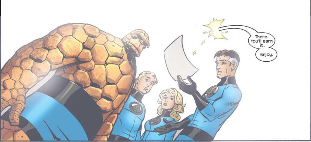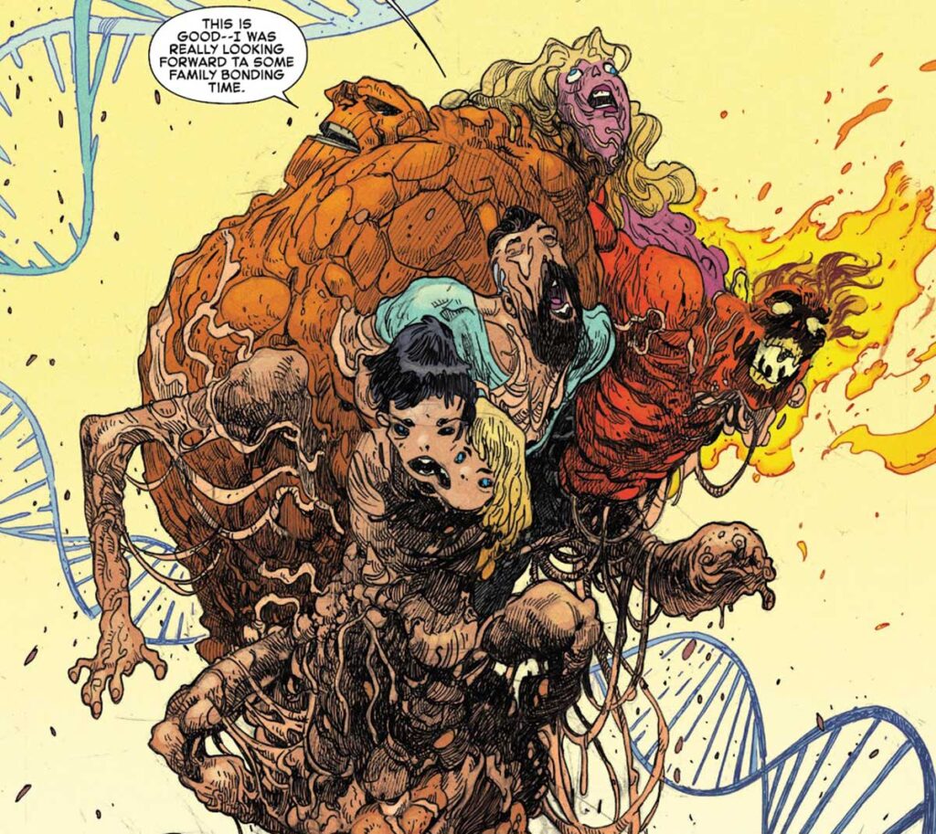 در حالی که بدنهای اعضای چهار شگفتانگیز در سطح زیراتمی دچار دگرگونی شد، ریچاردز فهمید که این گرد پر بود از پرتوهای کیهانی. فرانکلین و والریا فقط چند لحظه پیش از مرگ از خانواده خود خواستند تا با در هم آمیزش یک موجود گروتسک را بیافرینند و بدین گونه نیروی خود را بازیابی کنند. زمانی که بدنهایشان به حالت عادی بازگشت، فنتستیک فور توانستند رد مد تینکر را بزنند که نابغه پلیدی بود که چنین تلهای را برای این گروه چیده بود.