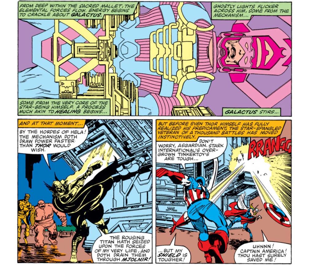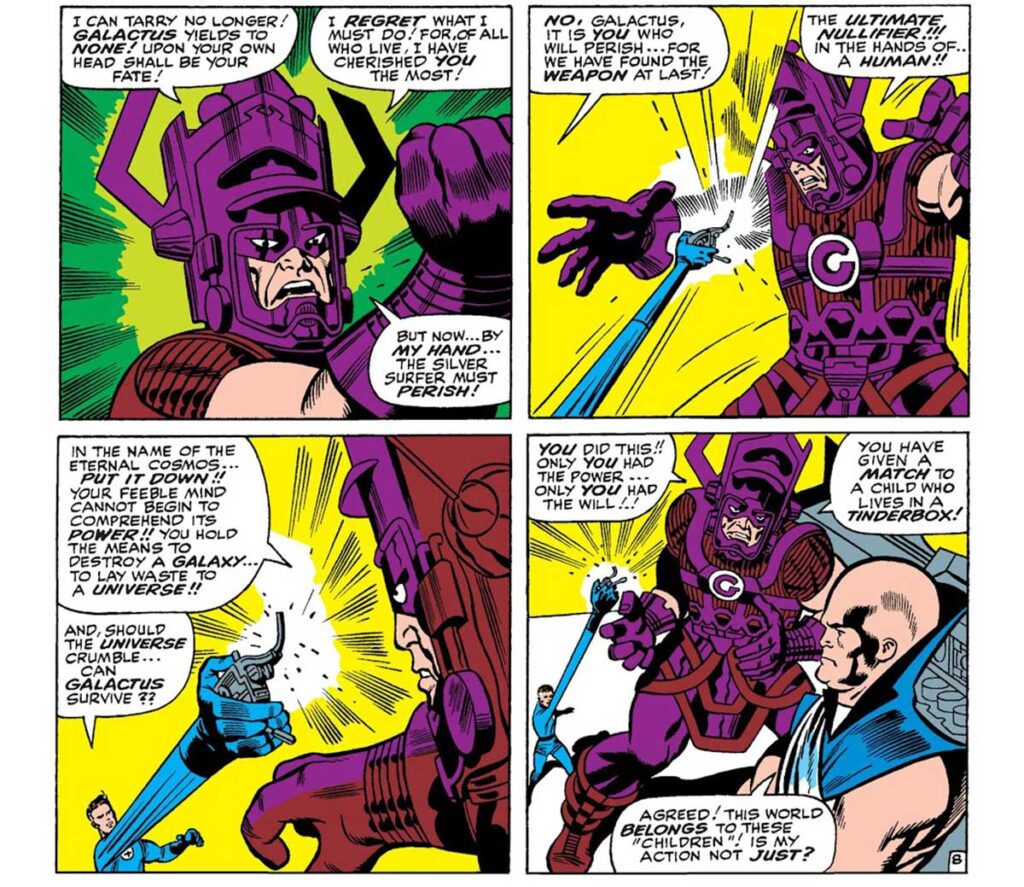 با این که چهار شگفتانگیز در طول همه این سالها دفعات زیادی با گالاکتوس جنگیدهاند، اما هنوز متوجه نقش اساسی او در توازن کیهانی کل هستی هستند. در شماره ۲۴۴ کمیک Fantastic Four، چهار شگفتانگیز و چندین عضو از اونجرز موفق به شکست گالاکتوس و نجات زمین از گرسنگی او شدند. با وجود این، آقای شگفتانگیز فهمید که نیاز به نجات این موجود کیهانی از مرگ است.