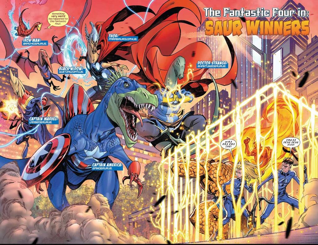 بعد از سقوط به دنیایی که هنوز در آن دایناسورها گونه چیره بر زمین هستند، چهار شگفتانگیز در شماره ۱۲ کمیک Fantastic Four سال ۲۰۲۲ با دایناسور اونجرز متحد شدند تا هم دنیای خود و هم جهان آنها را نجات دهند. در این ماجرا، چهار شگفتانگیز جای خود را با همتایان دایناسوریشان در دنیایی عوض کردند که شبیه به جهان مارول بود اما به جای انسانها، دایناسورها در زمین ساکن بودند. وقتی که رید متوجه شد این دو دنیا در حالت ترکیب با یکدیگرند، با دایناسور آیرون من همراه شد تا جلوی این اتفاق را بگیرد.