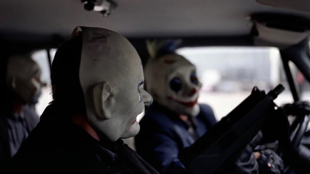 در سکانس افتتاحیه فیلم، گروهی از سارقان نقابدار با ماسک دلقک وارد یک بانک بزرگ میشوند تا نقشه سرقتی پیچیده را اجرا کنند. آنها در حین انجام نقشه مدام از رئیس مرموز خود حرف میزنند که لقب او جوکر است و به نظر میرسد بین آنها حضور ندارد. آنها توافق میکنند تا غنیمت را پس از سرقت میان خود تقسیم کنند، اما کار به خیانت کشیده میشود چند نفر کشته میشوند.