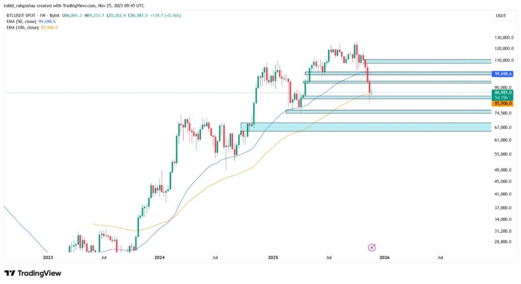 - ۸۲ تا ۸۵ هزار دلار: اولین و نزدیکترین حمایت مهم که همرده با میانگین متحرک ۱۰۰ هفتگی است و در اصلاحهای اخیر نقش موثری در جلوگیری از سقوط شدید قیمت ایفا کرده است.